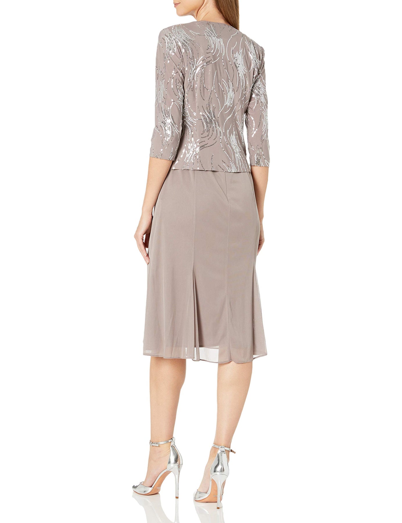 Make it a moment to shine in this Alex Evenings 196267SC. The dress features a tank top bodice embellished with firework patterned sequins and comes with a matching slim fit style jacket with three-quarter length sleeves and front button accent. The solid chiffon skirt flows to a tea-length hem with godet details. Look sophisticated and mature in this simple yet chic Alex Evenings creation.