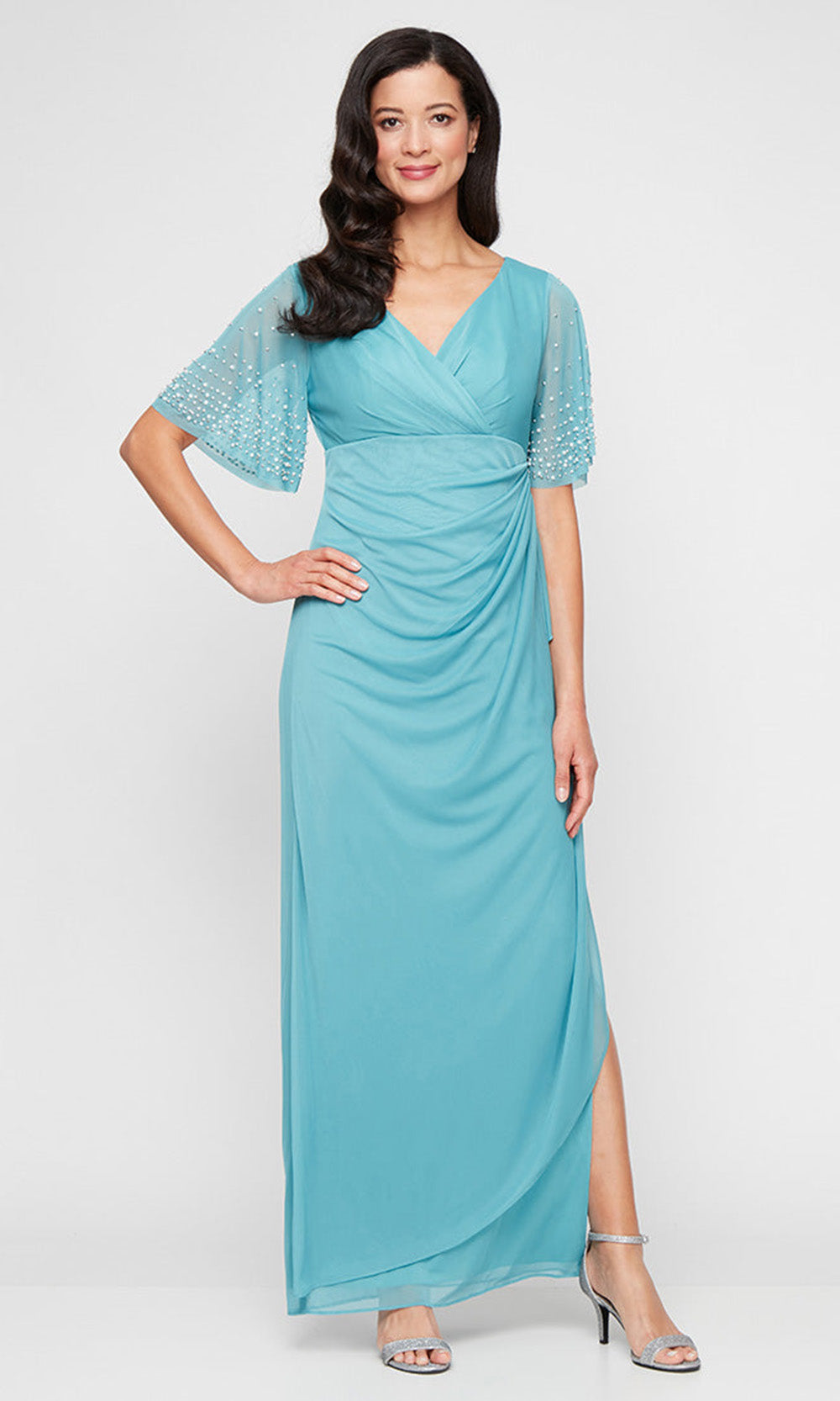 Timeless evening fashion is expressed through the Alex Evenings 81321016, offering a flattering silhouette and decorative sleeve accents. The sheer flutter sleeves feature intricate beading that adds gentle sparkle, while the surplice V-neckline enhances the upper body. A softly draped empire waist transitions into a column skirt with a side slit framed by cascading ruffle detail. Alex Evenings 81321016 provides an elegant solution for weddings, galas, and special evenings where beauty and comfort are desired. Models are wearing Teal, Fig, and Violet colors.