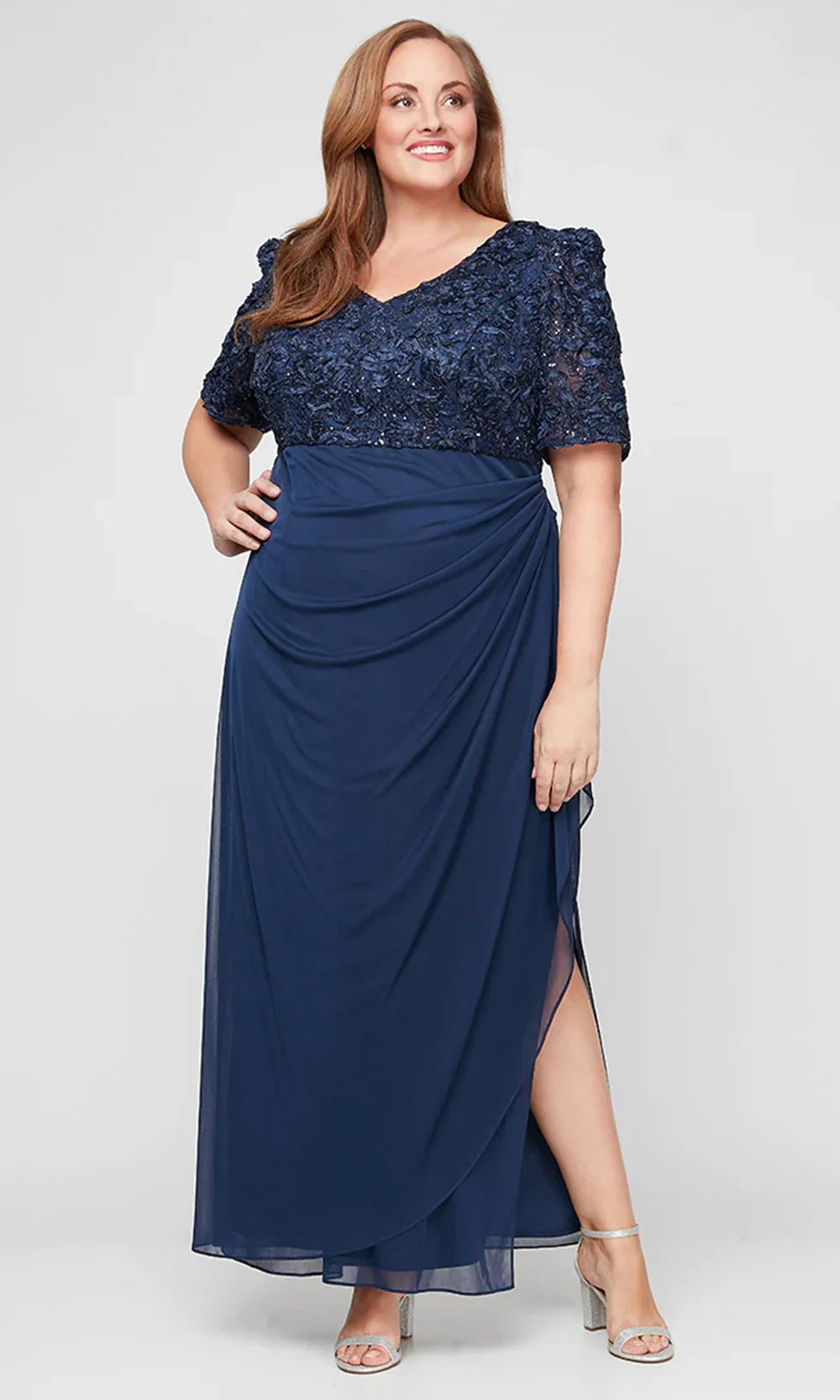 Designed for a flattering fit, this Alex Evenings 84122633 plus size dress features detailed styling that enhances curves. The soutache bodice adds visual depth while v-neckline and short puff sleeves frame the upper body with soft shape. From the empire waist, a cascade ruffle column skirt flows gently, creating graceful movement with each step. The structured design supports comfort for all-day wear at formal gatherings. With the Alex Evenings 84122633, refined style meets thoughtful tailoring for a polished and memorable appearance. Dress is shown in Missy size for reference. Models are wearing Deep Plum, Wisteria and Navy colors.