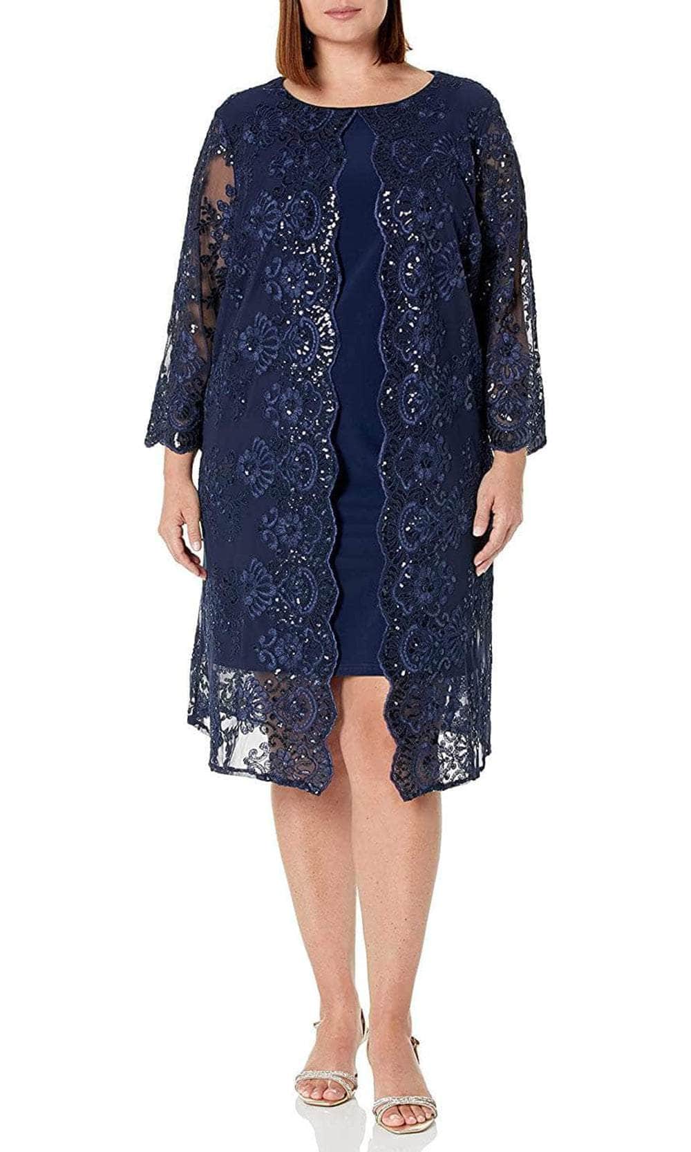 Wear this elegantly designed Alex Evenings 841712226 piece to outperform expectations at your upscale event. The long sleeve jacket has a sheer silhouette with gorgeous scallop details and is embellished with intricate embroidered details and iridescent sequins. The sheath dress has a scoop neckline and a hemline that falls above the knee. Alex Evenings' masterpiece will enchant everyone with its iridescent beauty. The model's outfit is navy.