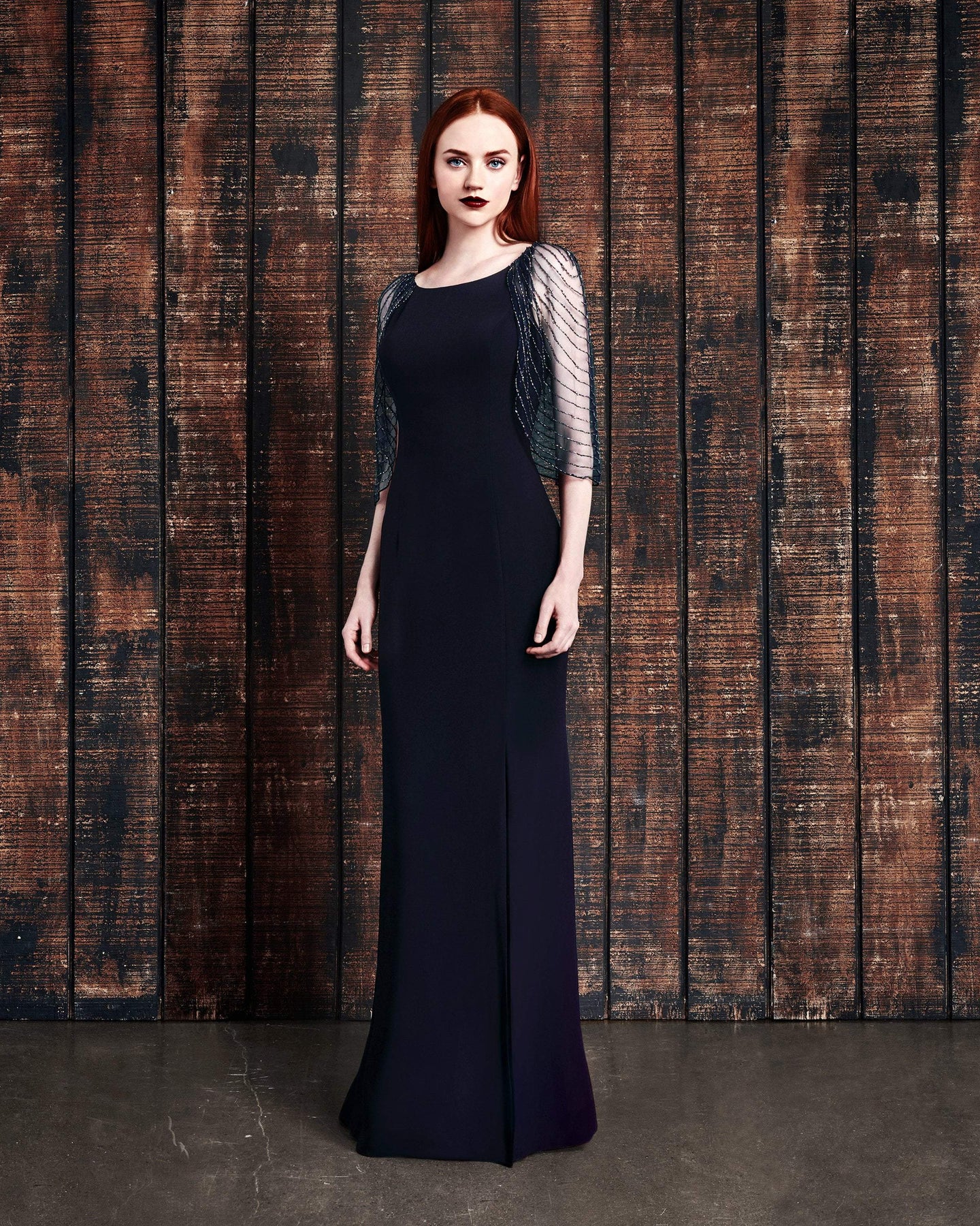 Details: Bead Embellished Cape, Fitted, Princess Seams, Side Slit, Full Length, Back Zipper Closure