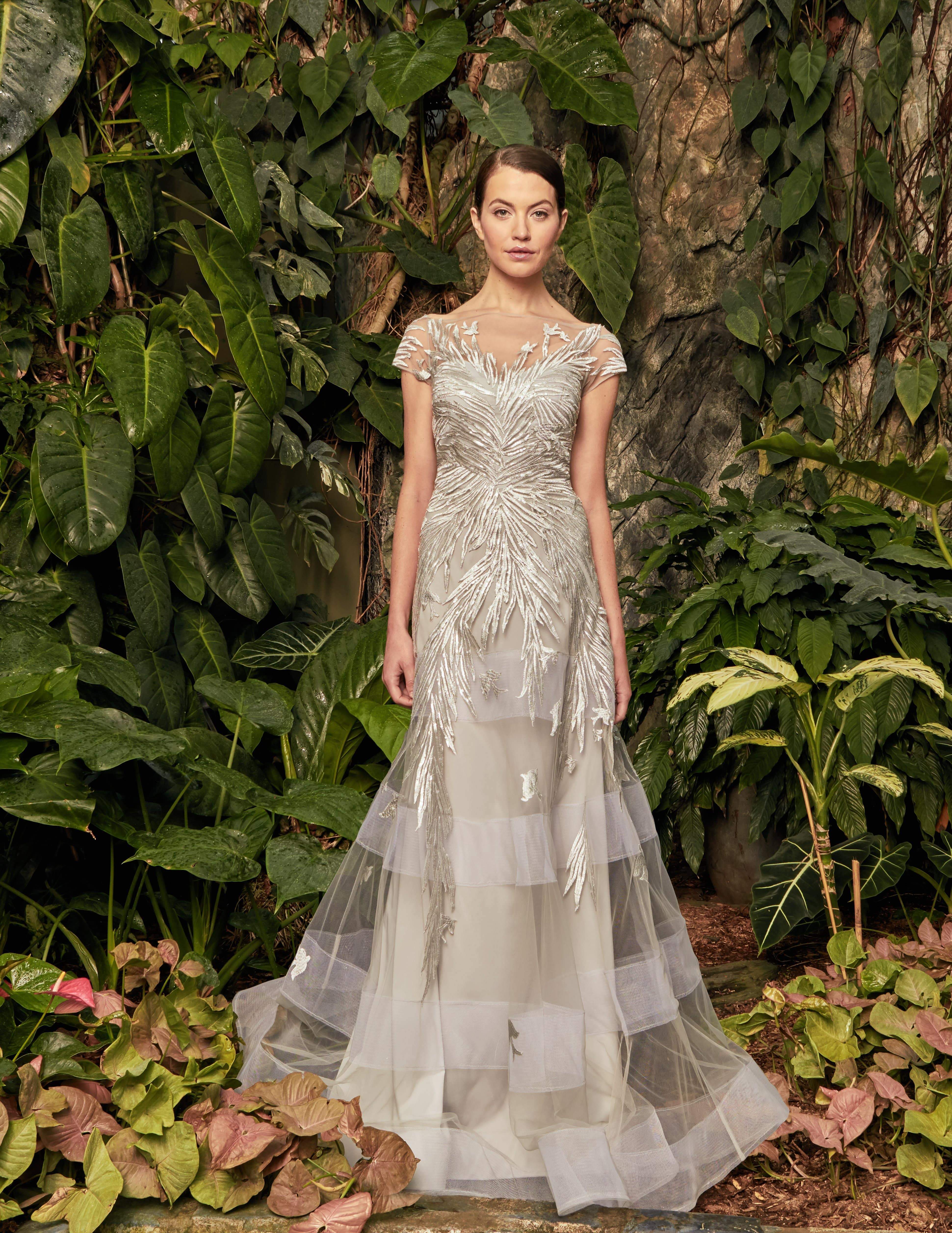 Details: Cap Sleeves, Sequined Embroidery, Striped Tulle, Illusion Full Back, Back Zipper Closure, Sweep Train