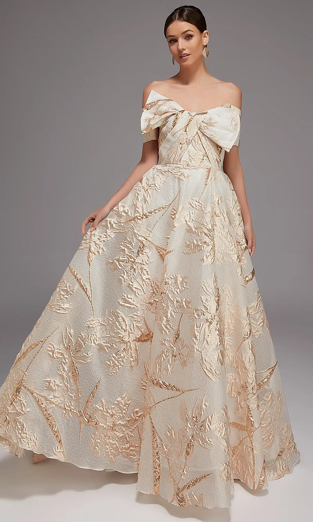 | Details: | Off shoulder neckline, ruffle bodice detail, metallic leaf motif design, full ball gown skirt, back zipper closure |