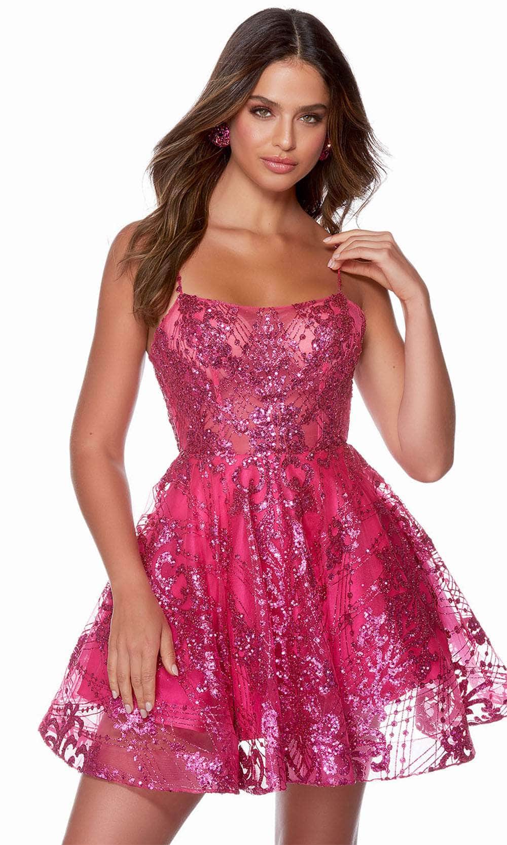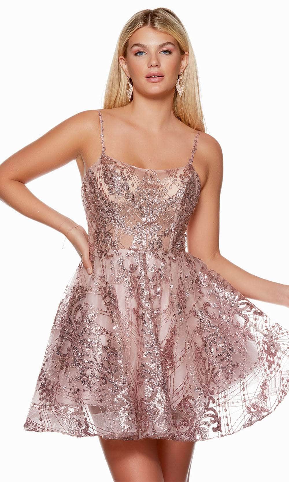 As you enter the scene wearing this stunning Alyce Paris 3122 design, make your presence felt. This dress features a sheer bodice with spaghetti straps and a scoop neckline, as well as an elaborate display of dazzling motifs that run the length of the dress. The dazzling dress has an open design at the small of the back and a lace-up bandeau detail. The skirt's hemline is short and has an A-line silhouette. This Alyce Paris 3122 masterpiece will give your special occasion a fantastic sense of style. Models are wearing the Raspberry and Pink Alabaster colors.