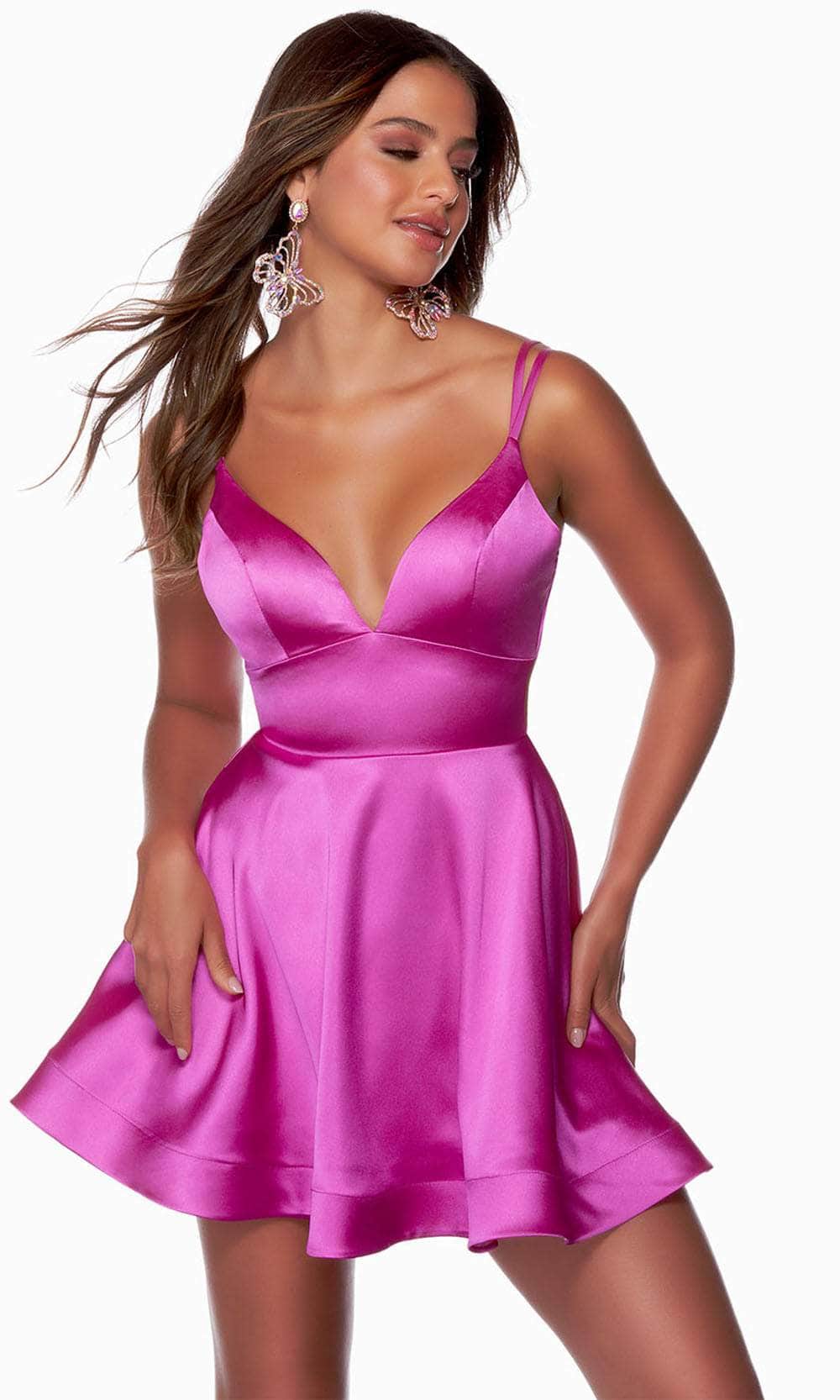 Be enchanted by the gorgeous Alyce Paris 3126 design's delicate features and outstanding beauty. This stunning dress features a luxurious satin silhouette with tailoring lines and a sleeveless Babydoll silhouette. This outfit, which exudes a hint of femininity, features a v-neckline that is accentuated with double spaghetti straps. The luminously rendered skirt has a low cutout in the back and an A-line silhouette with a little hem. It is nipped with an empire band, a lace-up bandeau, and an empire band. Take center stage while stealing the show with this breathtaking Alyce Paris 3126 masterpiece. Models are wearing the Neon Purple color.