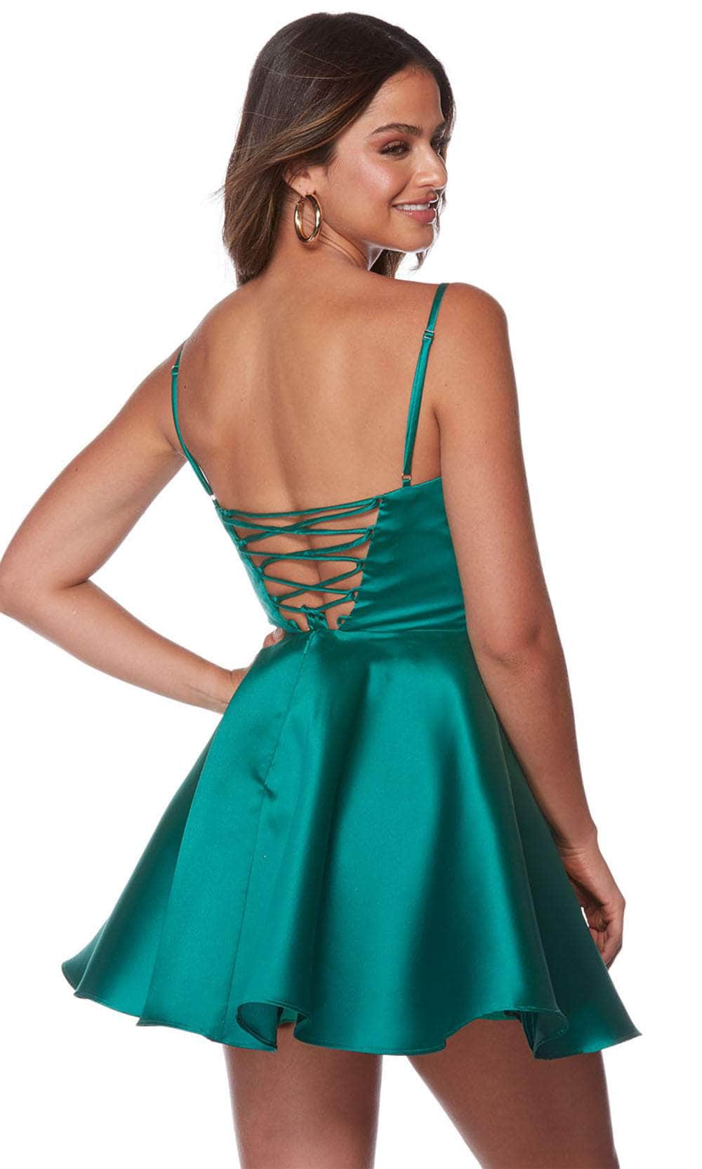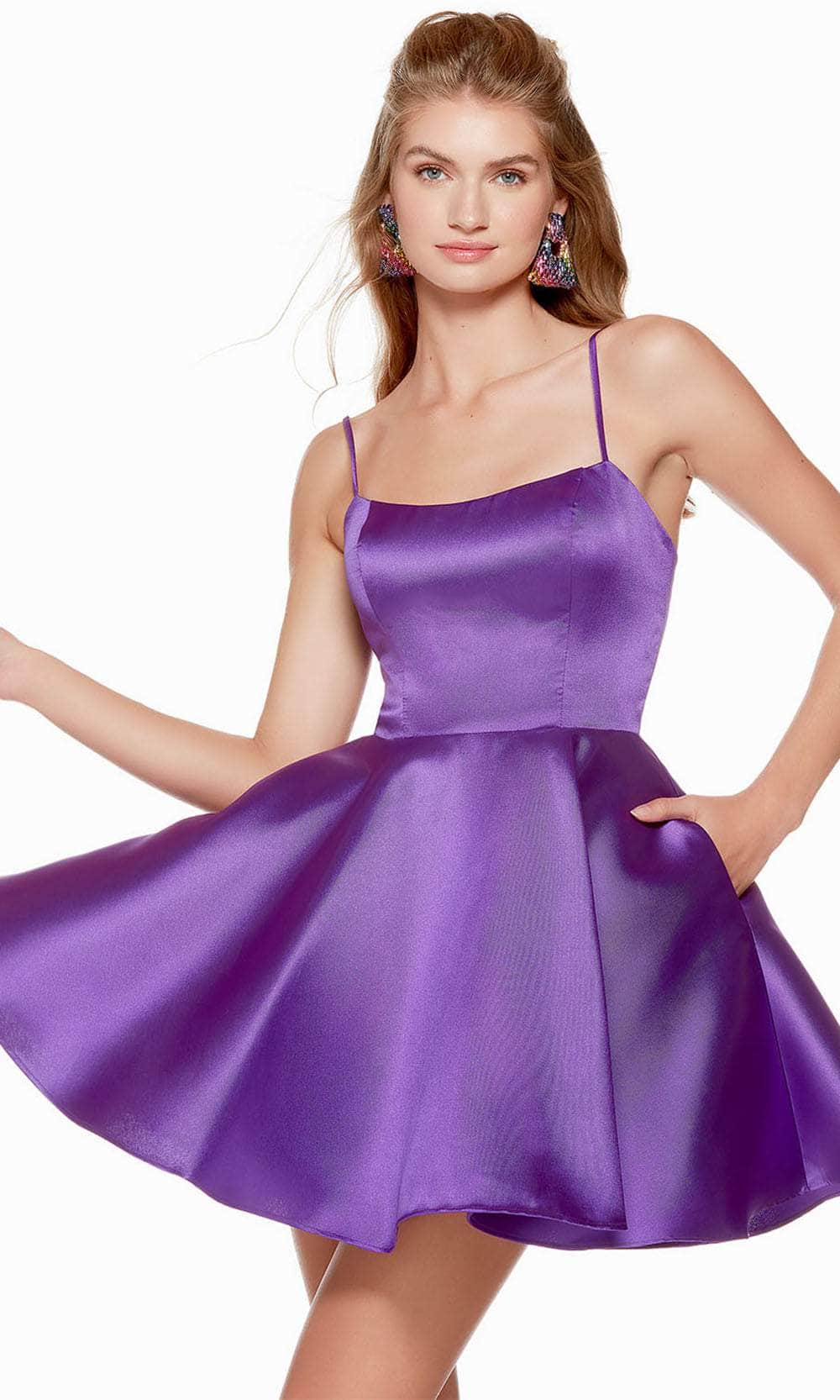 The fascinating cocktail dress Alyce Paris 3142, made from sumptuous Mikado satin, combines elegance with contemporary refinement. Your contours will be highlighted by the sleeveless fitted bodice's clean seams and attractive silhouette. The dress is supported by delicate, adjustable spaghetti straps that offer a comfortable fit, and it is capped with a stylish scoop neckline. As you turn, the dress's elegant elegance is enhanced by the open back, which is decorated with a lace-up tie. This lovely outfit is completed with a short A-line skirt. It's the goal of Alyce Paris 3142 to make you sparkle like a star. Model is wearing Pine and Purple color.