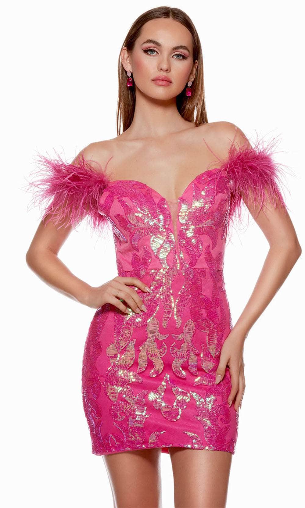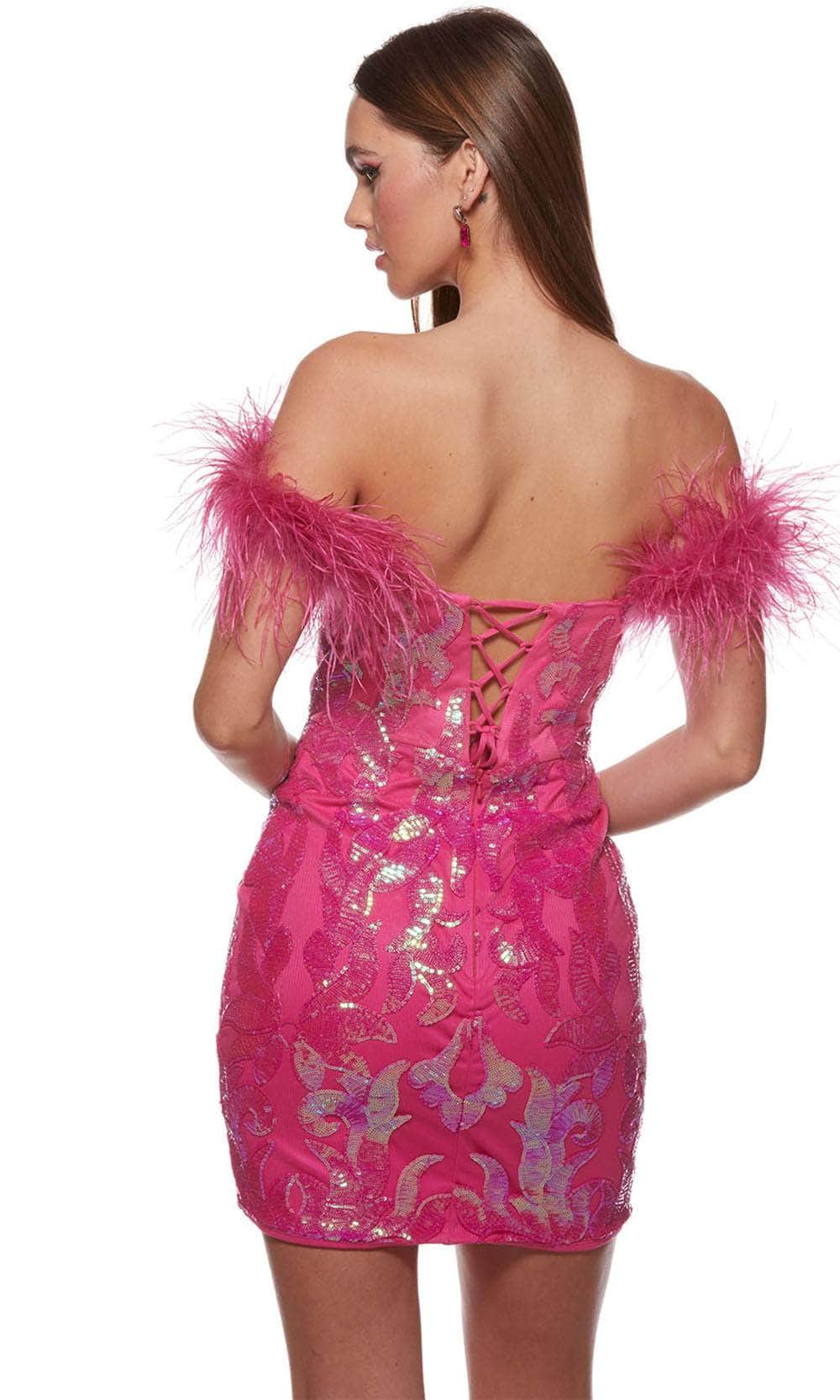 With the stunning Alyce Paris 4621 dress, you can take your fashion to the next level of elegance and leave everyone in wonder. A stunning show of illumination is produced with each stride thanks to the dress' generous use of sparkling sequins. A touch of ethereal appeal is added by the off-shoulder feathery embellished sleeves, and romance is radiated by the sweetheart neckline with a sheer insert. A precise fit is guaranteed by the lace-up tie and back zipper closure. The outfit is finished with grace and allure by the short sheath skirt. The option of Alyce Paris 4621 is intriguing. Model is wearing Electric Fuchsia color.