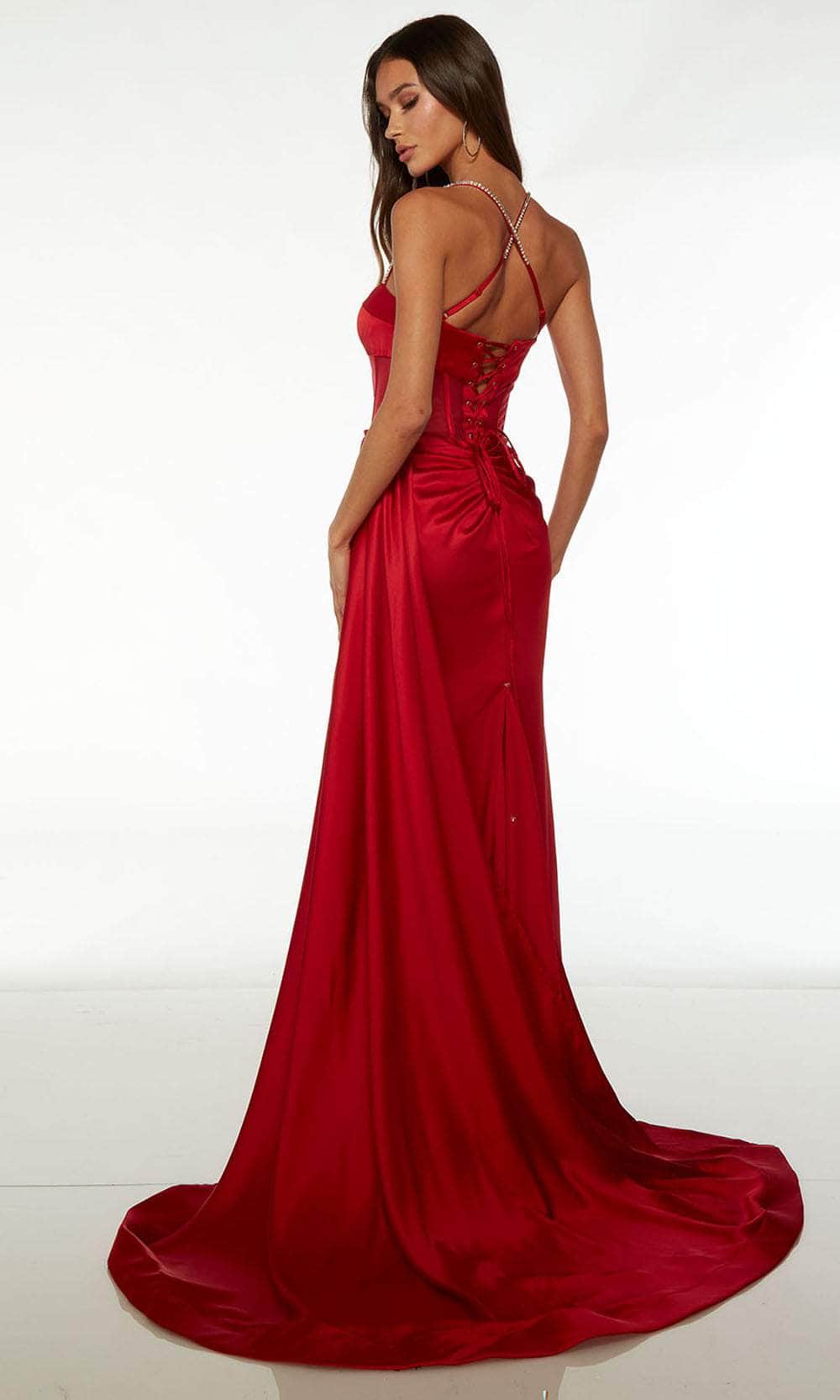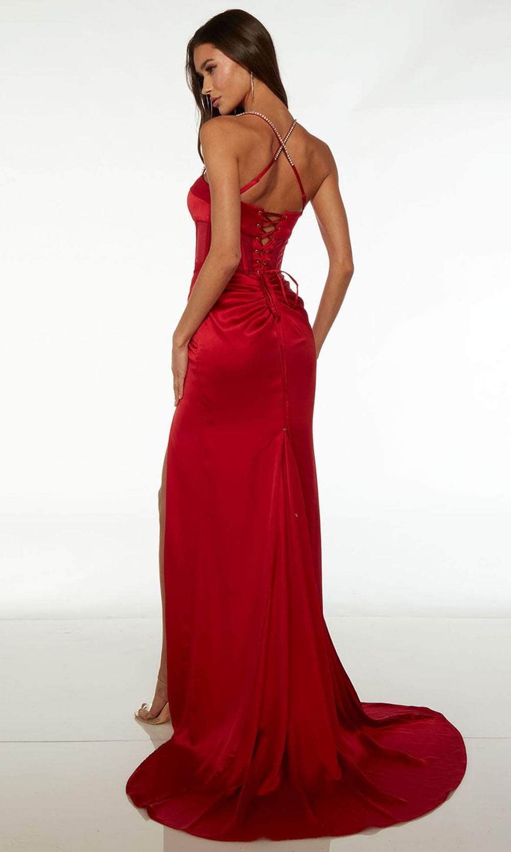 Create an enchanted moment wearing this Alyce Paris 61486 creation. This sleeveless dress is beautifully made to accentuate your lavishness and timeless beauty. It displays a straight-across neckline, illusion corset boning bodice, and a plunging illusion inset detail on the bust. The breathtaking mid-open back reveals an adjustable lace-up tie closure and beaded spaghetti straps form a crisscross pattern. The skirt falls gracefully to the floor and sweeping train, creating a lovely sheath silhouette. To top it off, the front thigh-high slit adds a seductive touch, while the removable side sash creates a dramatic effect. Be the belle of the evening in this Alyce Paris 61486 masterpiece. Models are wearing Black, and Red colors.
