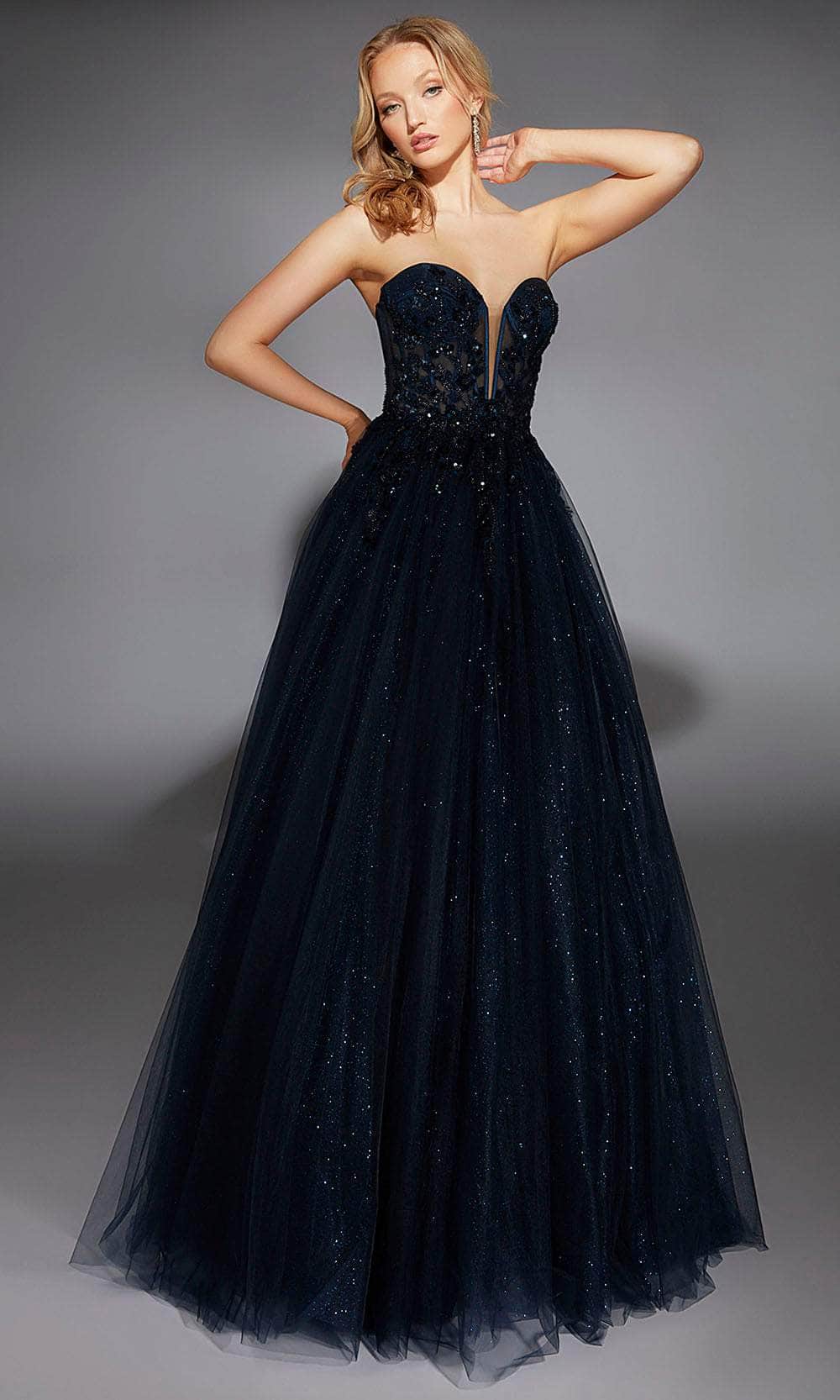 Indulge in the fairytale elegance of the Alyce Paris 61846 ballgown. This exquisite style features a dazzling beaded and lace applique bodice that catches the light beautifully, paired with a voluminous tulle skirt for a grand ballgown silhouette. The plunging sweetheart neckline adds a hint of allure, complemented by a natural waistline that enhances the figure. Designed for those who love drama and sophistication, this gown is ideal for formal occasions. Step into the spotlight with the Alyce Paris 61846 and make a lasting impression in its mesmerizing sparkle and grace. Model is wearing Midnight color.
