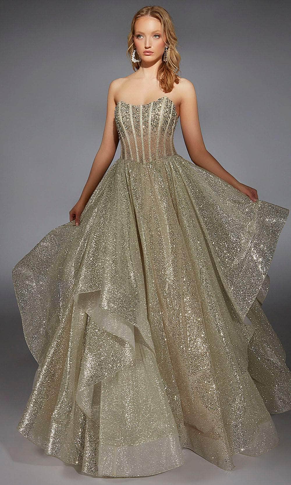 Elevate your eveningwear with the Alyce Paris 61971, a mesmerizing strapless ballgown crafted from dazzling crystal ice. The sheer structured bodice offers a sophisticated allure, while the layered skirt adds volume and movement. Designed for those who love a regal touch, this gown is perfect for galas, proms, and special events. The sweeping train ensures a grand entrance, making you the center of attention. Make a statement and shine all night in the Alyce Paris 61971. Model is wearing Champagne color.