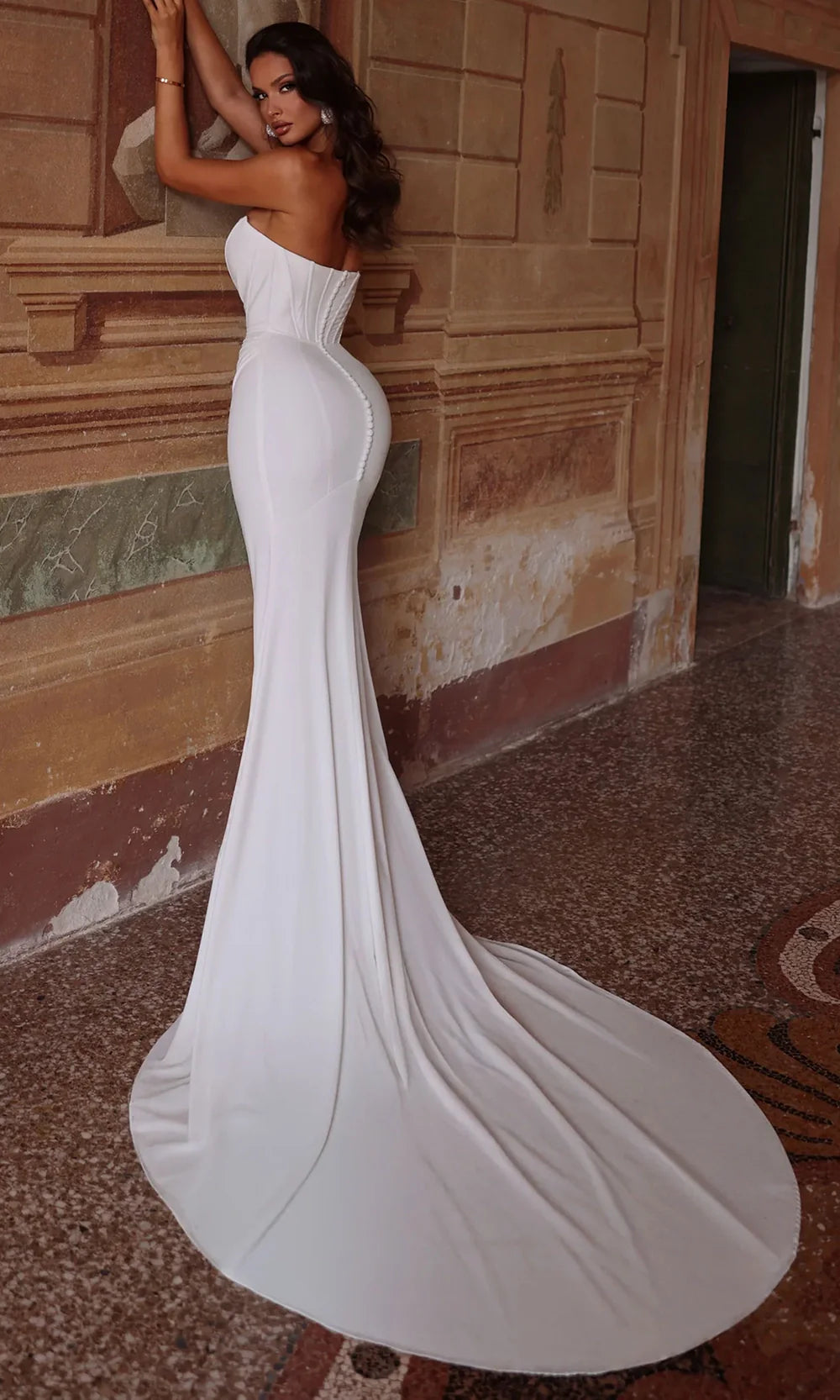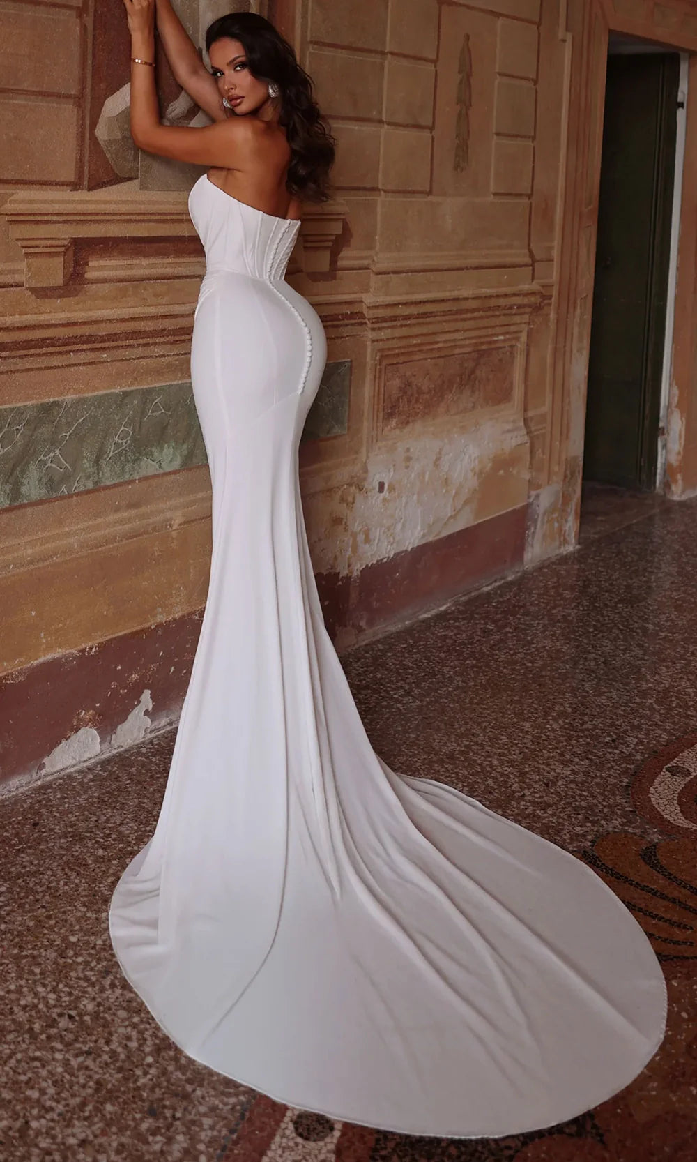 Details: | Strapless, Ruched Waist, Front Slit, Sweep Train, Corset Boning Bodice, Covered Back Buttons |