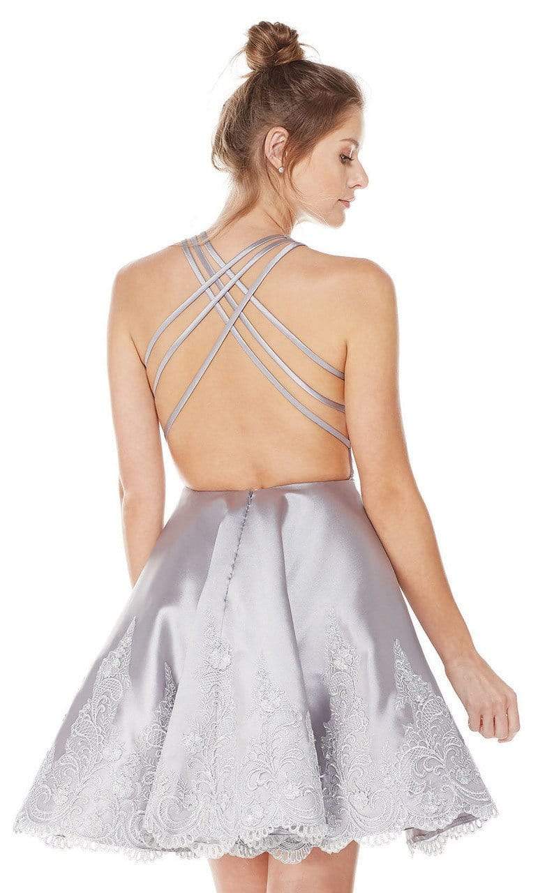 Short cocktail length dress features sleeveless fitted bodice, plunging V-neckline, strappy open back with back zipper closure. The A-line skirt is adorned with lace appliques and finishes in a scalloped hemline. A perfect outfit for homecoming, graduation, or semi-formal occasion.