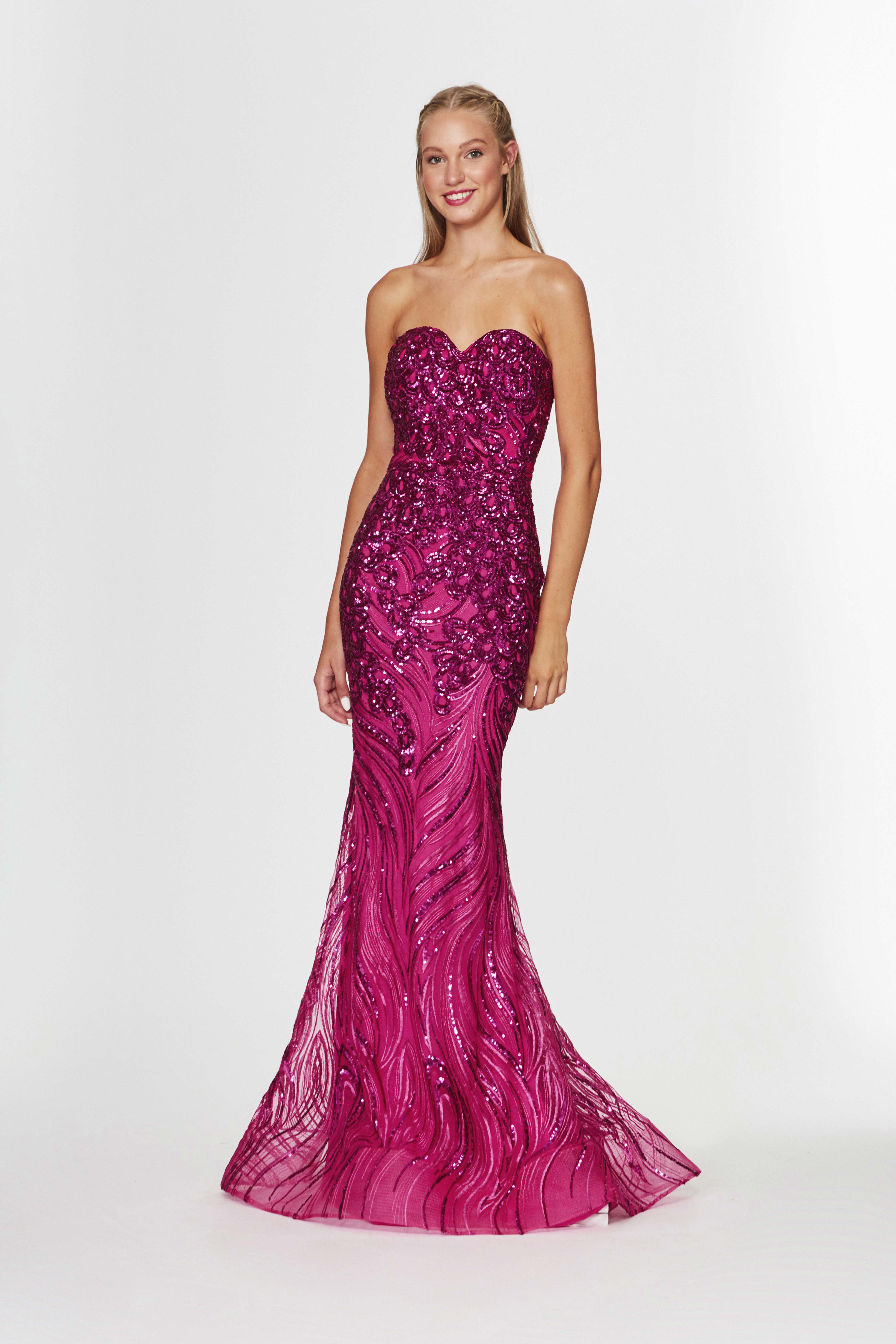 Details: | Fully Sequined, Fitted, Strapless, Flared Skirt, Full Length, Mid-Open Back, Back Zipper Closure, Sweep Train |