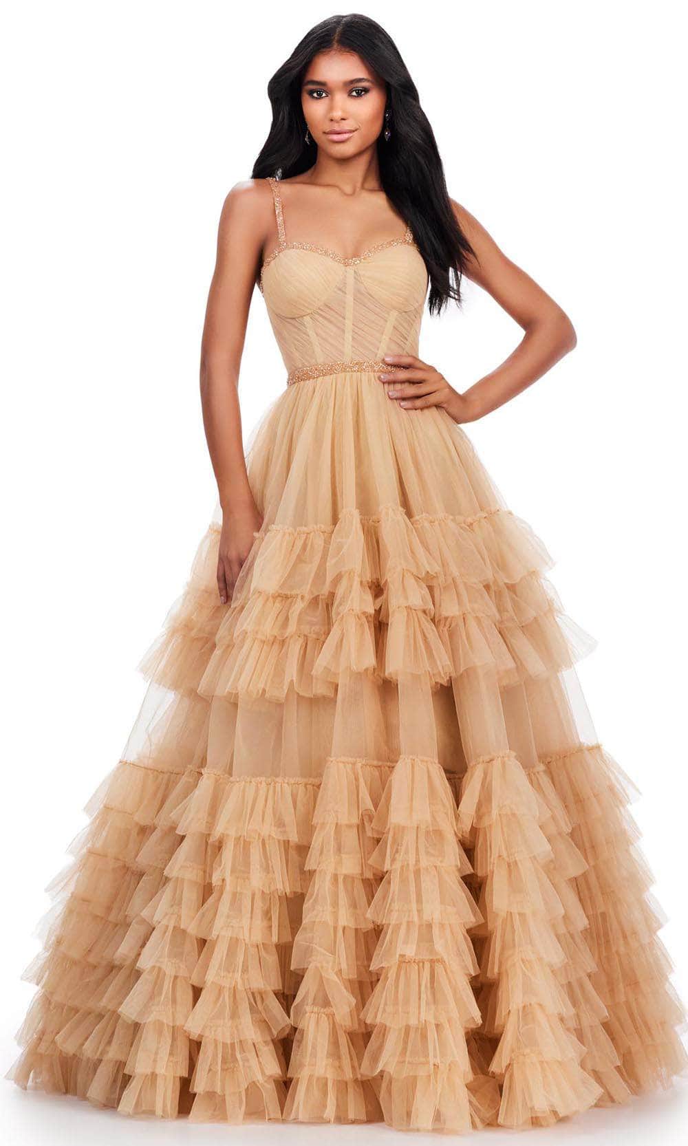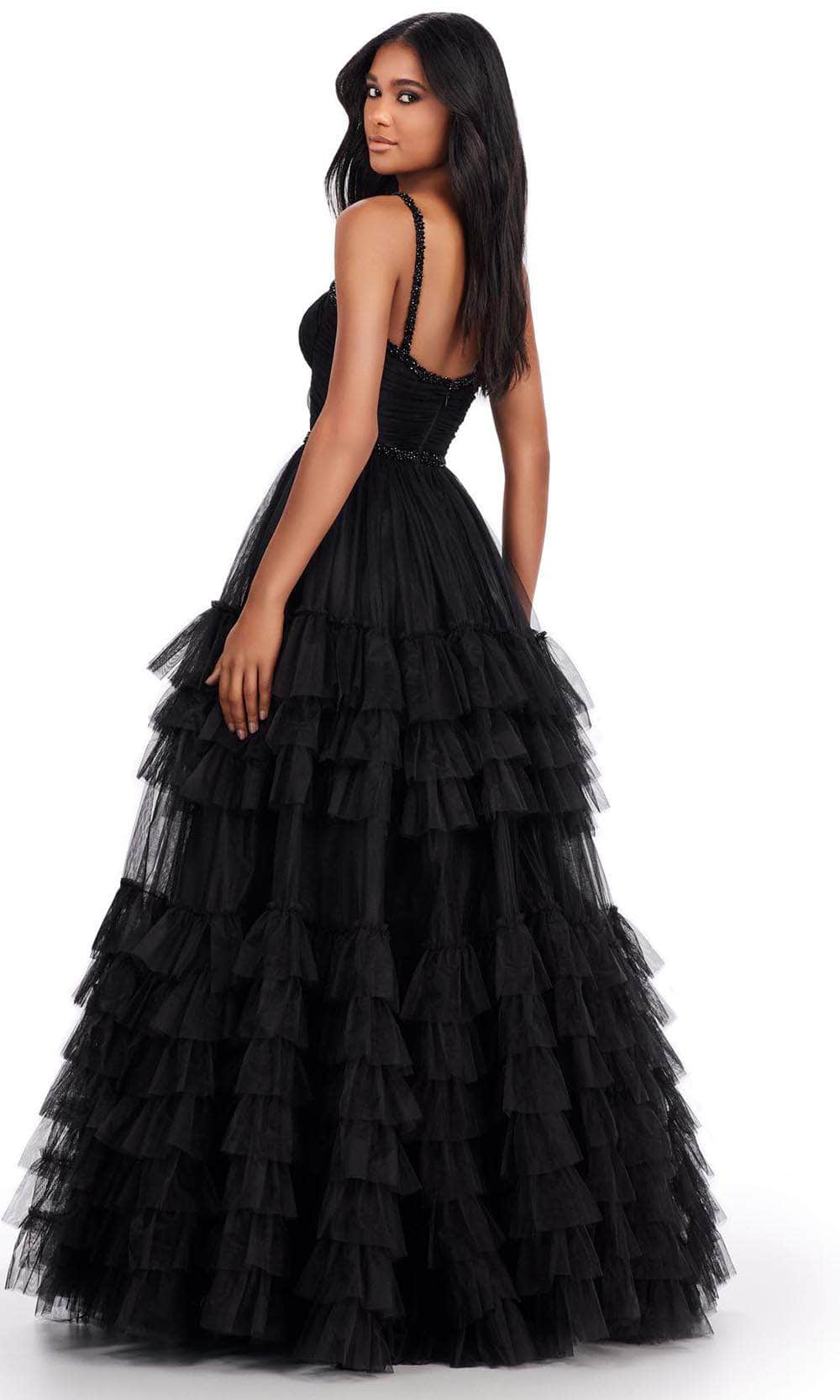Make an astounding entrance in the Ashley Lauren 11603 masterpiece. Featuring delicate spaghetti straps and a sweetheart neckline, the gown is highlighted by beaded trims that adds a hint of sparkle. The ruched bodice adds a touch of texture, while the beaded thin waistband perfectly accentuates your waist. A hidden zipper closure at the midrise back ensures a seamless, secure fit. The A-line skirt falls gracefully to the floor, finished with layered ruffled tiers that bring both movement and a touch of drama to this timeless design. This Ashley Lauren 11603 creation is all set to make that your night extra special. Models are wearing Black, and Nude colors.
