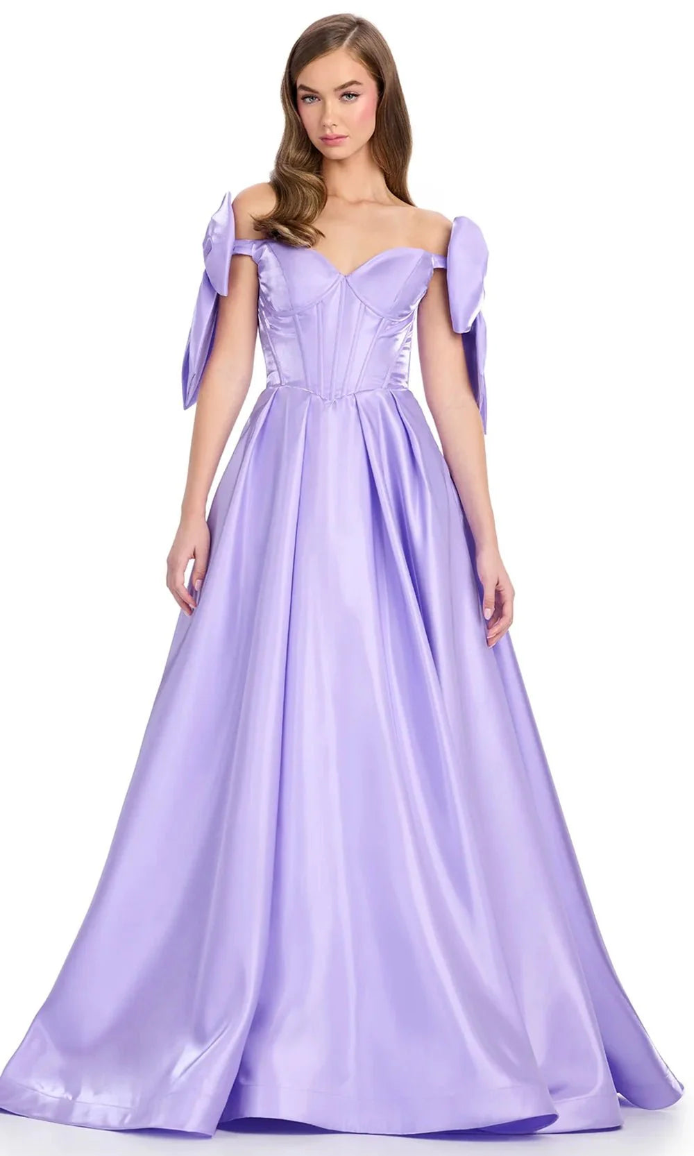 Be the showstopper of the evening in this breathtaking gown from Ashley Lauren 11871. Featuring a corset bustier with exposed boning, this gown offers both structure and a beautiful, flattering fit. The off-shoulder sleeves adorned with bow accents, blend romance and style. A beautifully designed sweetheart neckline, Basque waist, and midrise back add a hint of allure. The box pleats lend extra volume and movement to the skirt, forming a regal ballgown silhouette that reaches the full-length hemline. The Ashley Lauren 11871 gown creates unforgettable memories at prom. Models are wearing Black/White, Hot Pink, Lilac, Red, and White colors.
