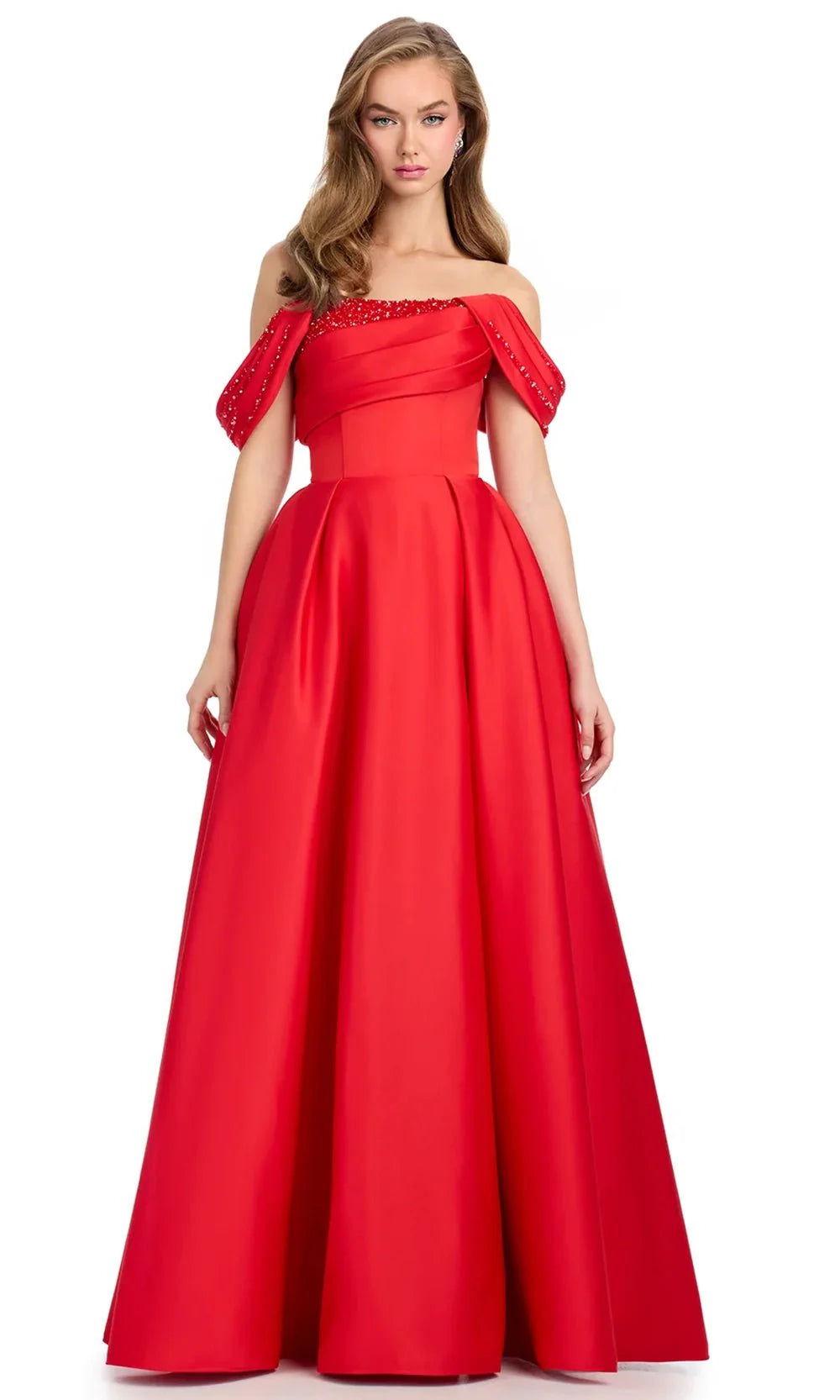 Exude confidence as you walk to the hall, fascinating everyone in the Ashley Lauren 12017 masterpiece. This satin gown catches the eye with asymmetrical pleats and a sparkling beaded adornment on the top bodice. The features include a straight-across neckline, draped off-shoulder sleeves, and a mid-rise back. Feel like a princess in the A-line skirt, enriched with box pleating for added volume and a touch of glam. Dress to impress with this Ashley Lauren 12017 long gown. Models are wearing Red, and Royal colors.