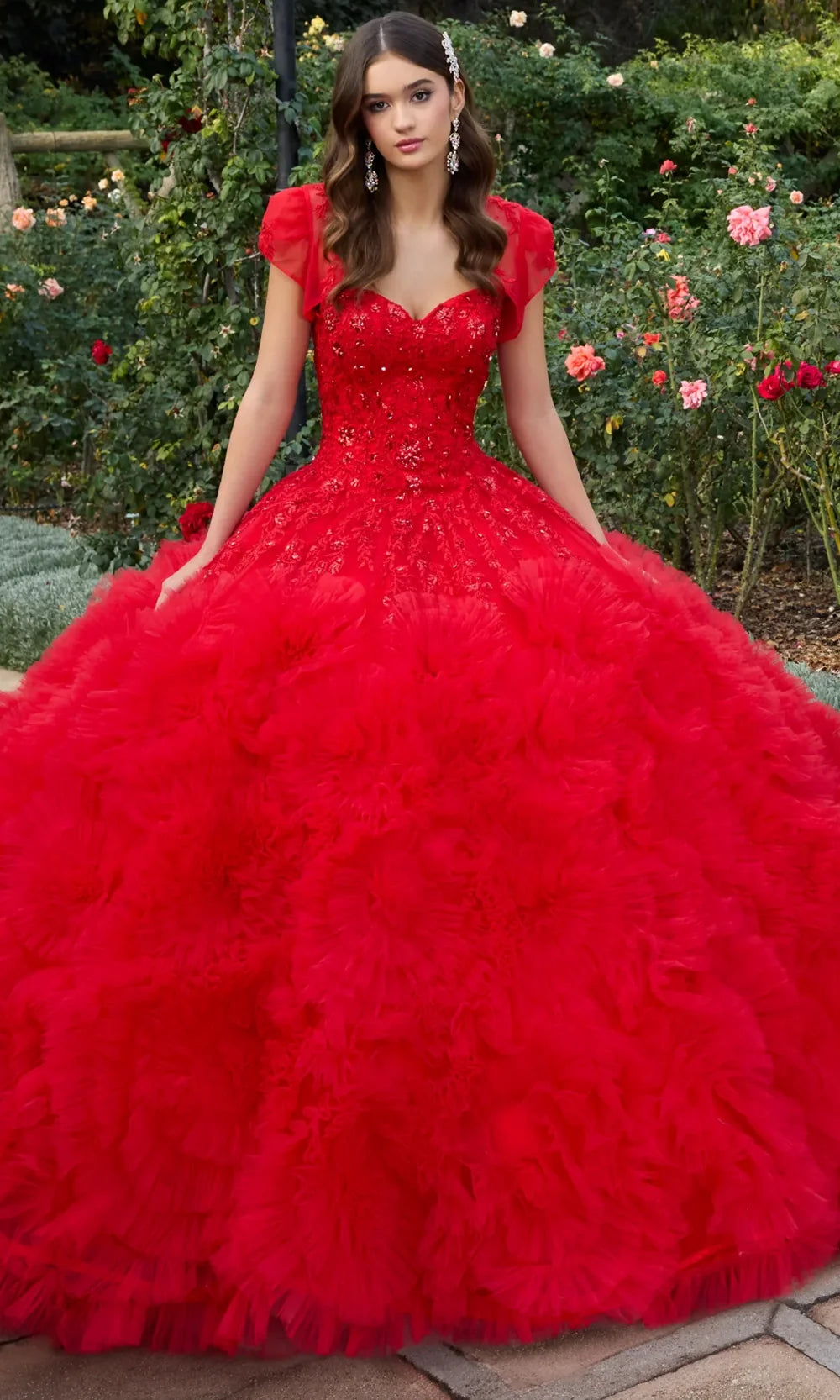 The Ashley Lauren 30104 makes an unforgettable impact with its fusion of refined structure and fashion-forward flair, setting a new standard for statement style. The strapless sweetheart neckline and beaded embroidered top brings a romantic tone, while the corset lace-up back ensures personalized fit. A ballgown skirt adorned with dimensional floral ruffles flows into a dramatic sweep train, creating a breathtaking sense of movement and drama. With its included bolero adding softness and coverage, this Ashley Lauren 30104 design is perfect for celebratory moments where fantasy meets elegance in perfect harmony. Models are wearing Peacock, and Red colors.