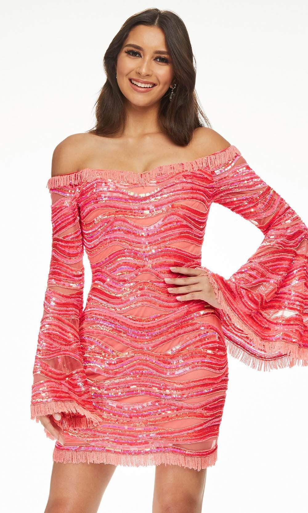 Establish your unanimous dominance on the dance floor by putting on this unforgettably beautiful Ashley Lauren 4440. Wear this sequin adorned dress to dance the night away while exuding a glamorous mood. This masterpiece boasts off the shoulder flutter sleeves, a fitted bodice, and a sheath shape. Closure is accomplished using a back zipper. On the neckline, sleeves, and hem are beaded fringe trim. Undoubtedly irresistible is going to be the description that the people in the party will give you while wearing this Ashley Lauren 4440. Models are wearing Blue and Hot Pink colors.
