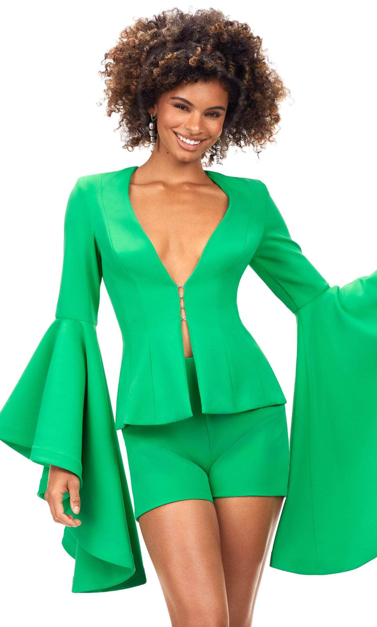 Walk the red carpet in style wearing this stunning Ashley Lauren 4572 romper dress. The two-piece design of this will attract a lot of positive attention and compliments. Your look begins with a long jacket featuring a V-neck and full back, three hook-and-eye closures at the front, and tailoring seams that create stunning bell sleeves and a delicate flare, drawing attention to your figure. A romper short is a perfect match to this stylish creation. Indulge in a fantastic evening in this stunning Ashley Lauren 4572 romper. Models are wearing Fuchsia, Green, and Neon Orange colors.