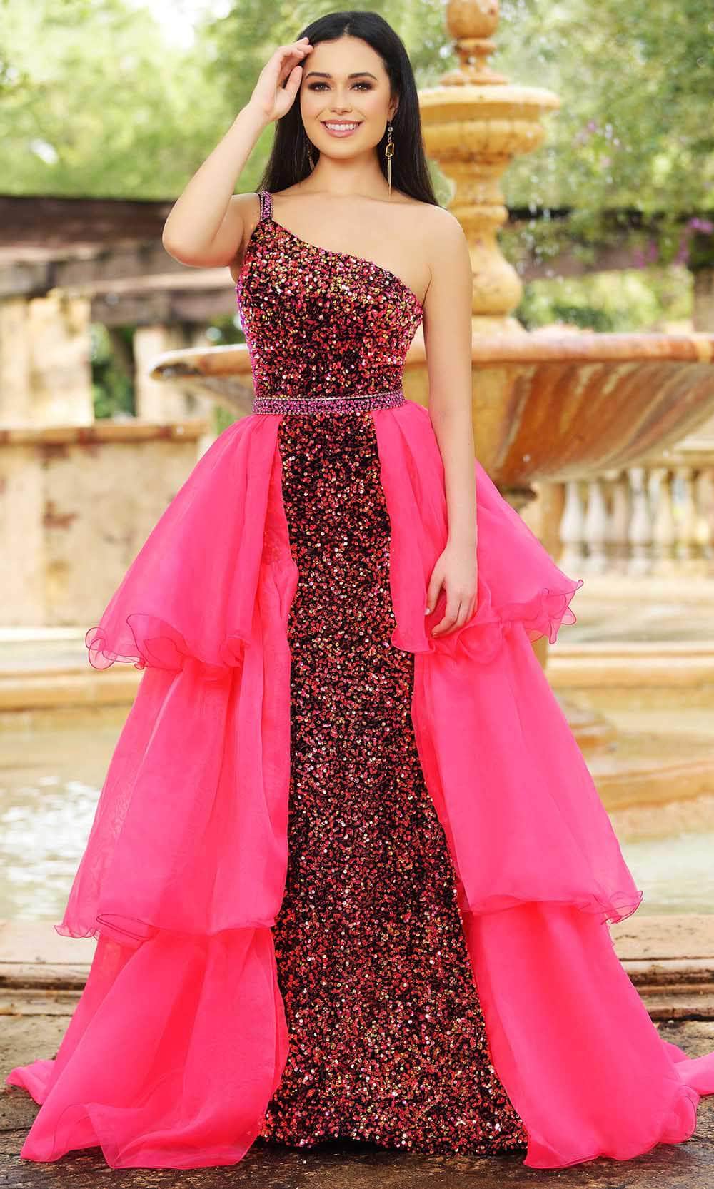 Exude an enchanting allure while adorned in the enchanting by Ava Presley 27715 creation. This exceptional gown showcases an asymmetric neckline, gracefully supported by delicate single-sided spaghetti straps. Its A-line skirt glimmers, embellished with sequins and enhanced by a detachable belt featuring a contrasting overlay of multi-tiered layers. The gown flows elegantly to the floor, completing its look with a subtle sweep train. Prepare to captivate all who lay eyes upon you with the irresistible charm emanating from this vibrant Ava Presley 27715 masterpiece. Models are wearing the Black/Hot Pink and Iridescent White colors.