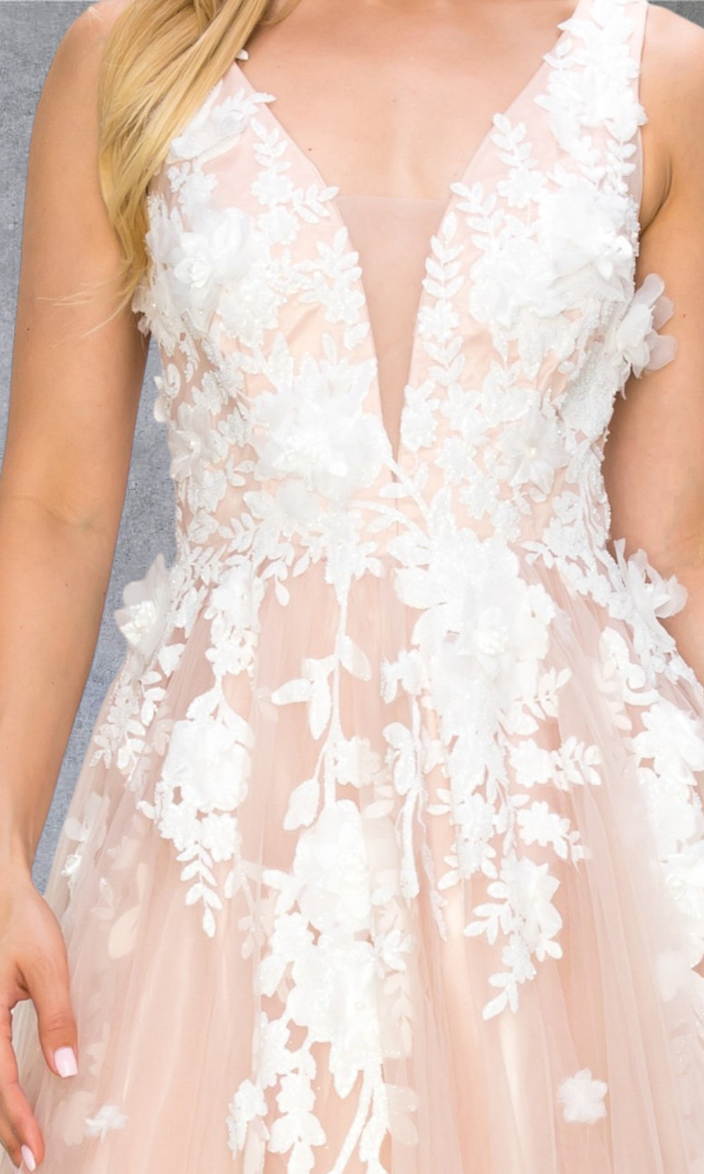 | Details: | Sleeveless, Illusion Bodice, 3D Organza Floral Applique, Pearl, Beaded, V-Open Back, Layered Skirt |