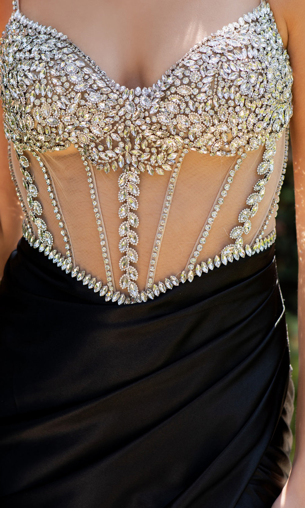 | Details: | Spaghetti Straps, Sheer Boned Corset, Ruched, High Slit, Mid-Open Back, Zipper Closure |