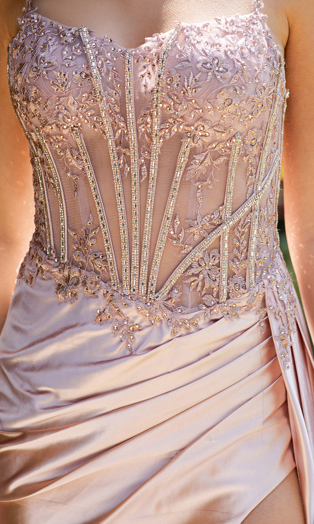 Details: Spaghetti Straps, Illusion Corset Bodice, Floral Embroidery, Beaded, Sequin, Side Draped, High Slit, Sweep Train