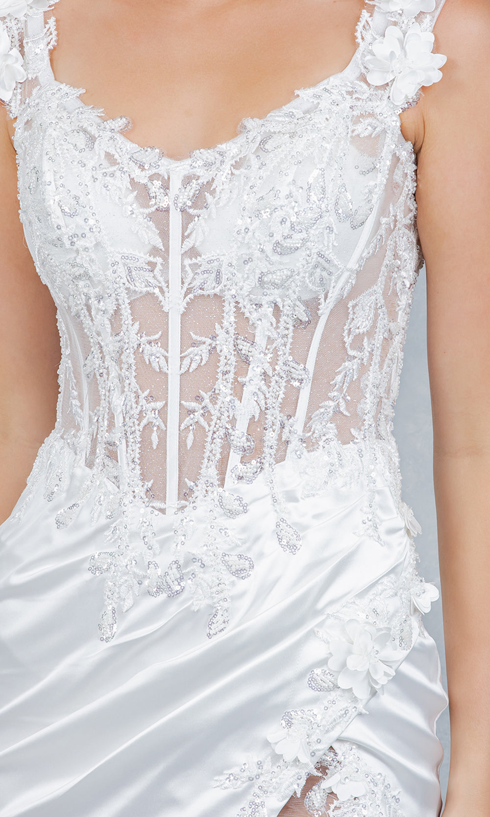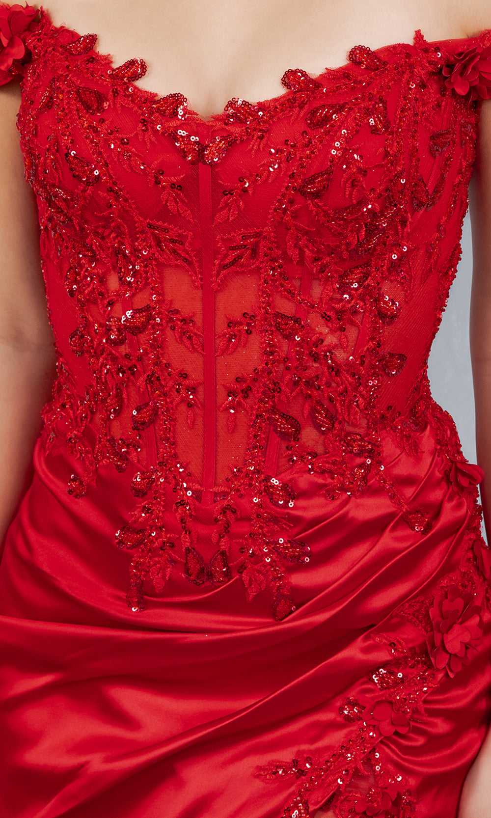 Details: Off-Shoulder Sleeves, 3D Floral Appliques, Embroidery, Beaded, High Slit, V-Open Back, Fitted Mini