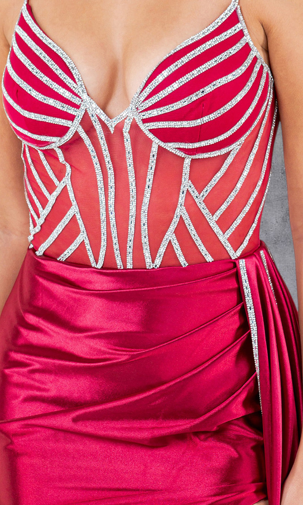 Details: Spaghetti Straps, Illusion Bodice, Beaded, Side Draped, High Slit, Sweep Train, Scoop Back