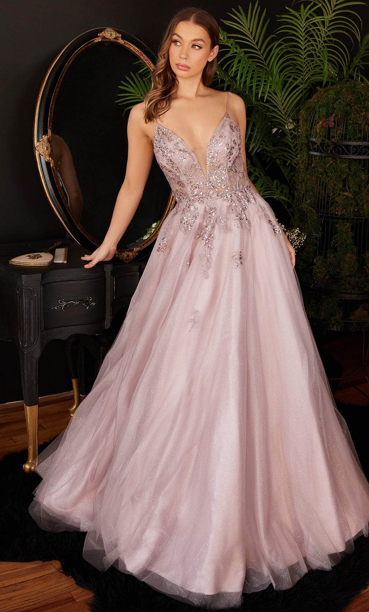Elevate your beauty in this stunning creation from Cinderella Divine CB117, an exquisite gown that radiates sophistication. The sheer sleeveless bodice highlights a plunging V-neckline with a sheer inset, elegantly supported by thin straps. Adorned with dazzling crystal embellishments, the fitted bodice offers an opulent touch. The dress culminates in a fabulous tulle A-line silhouette that glimmers with grace. This Cinderella Divine CB117 design is perfect for any lady desiring a striking style and perfect fit. Model is wearing Dusty Rose color.