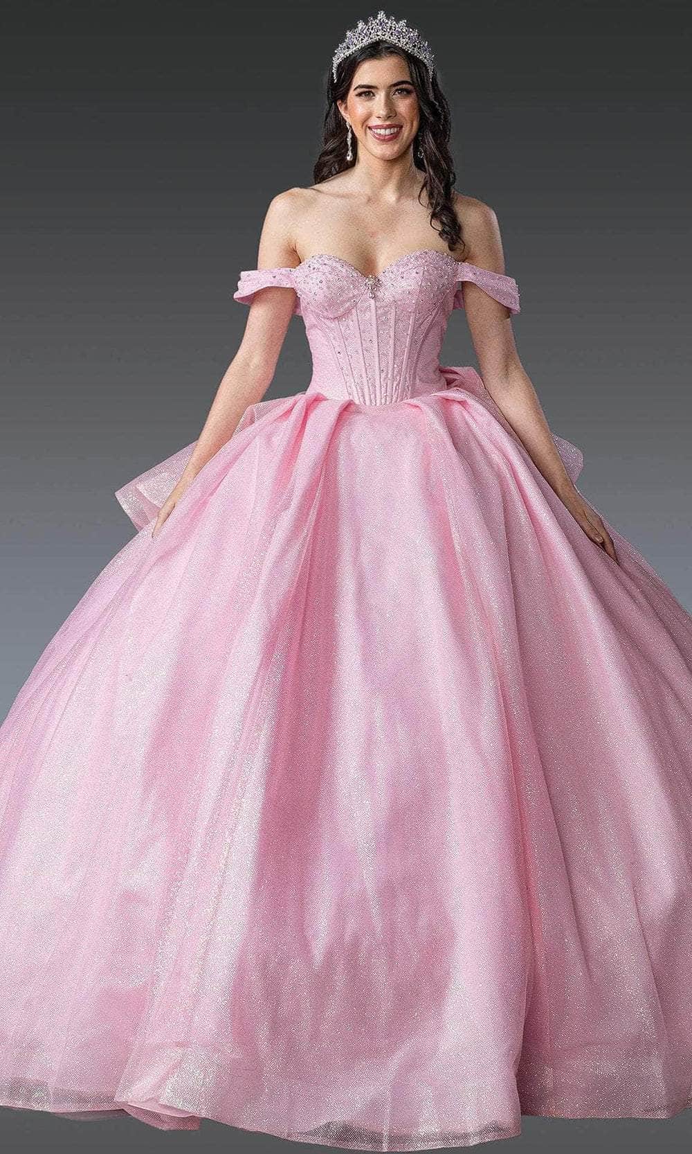 Step into timeless elegance with the Dancing Queen 1937, a gown designed to dazzle. The glittered mesh fabric adds luxurious sparkle, while the off shoulder sleeves, sweetheart neckline and heart-shaped brooch exude classic sophistication. A natural waistline seamlessly transitions into a full ballgown skirt, creating a silhouette that flatters every figure. The lace up back ensures comfort and style. Perfect for quinceaneras, galas, or lavish celebrations, the Dancing Queen 1937 promises an enchanting presence on any special occasion. Models are wearing Royal Blue, Black, Fuchsia, Lilac, Mint, and Pink colors.