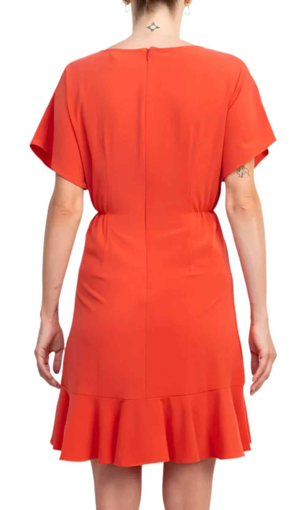 | Details: | Short Sleeves, Ruffle Hem, Relaxed Fit, Side Ruching, Concealed Back Zipper |