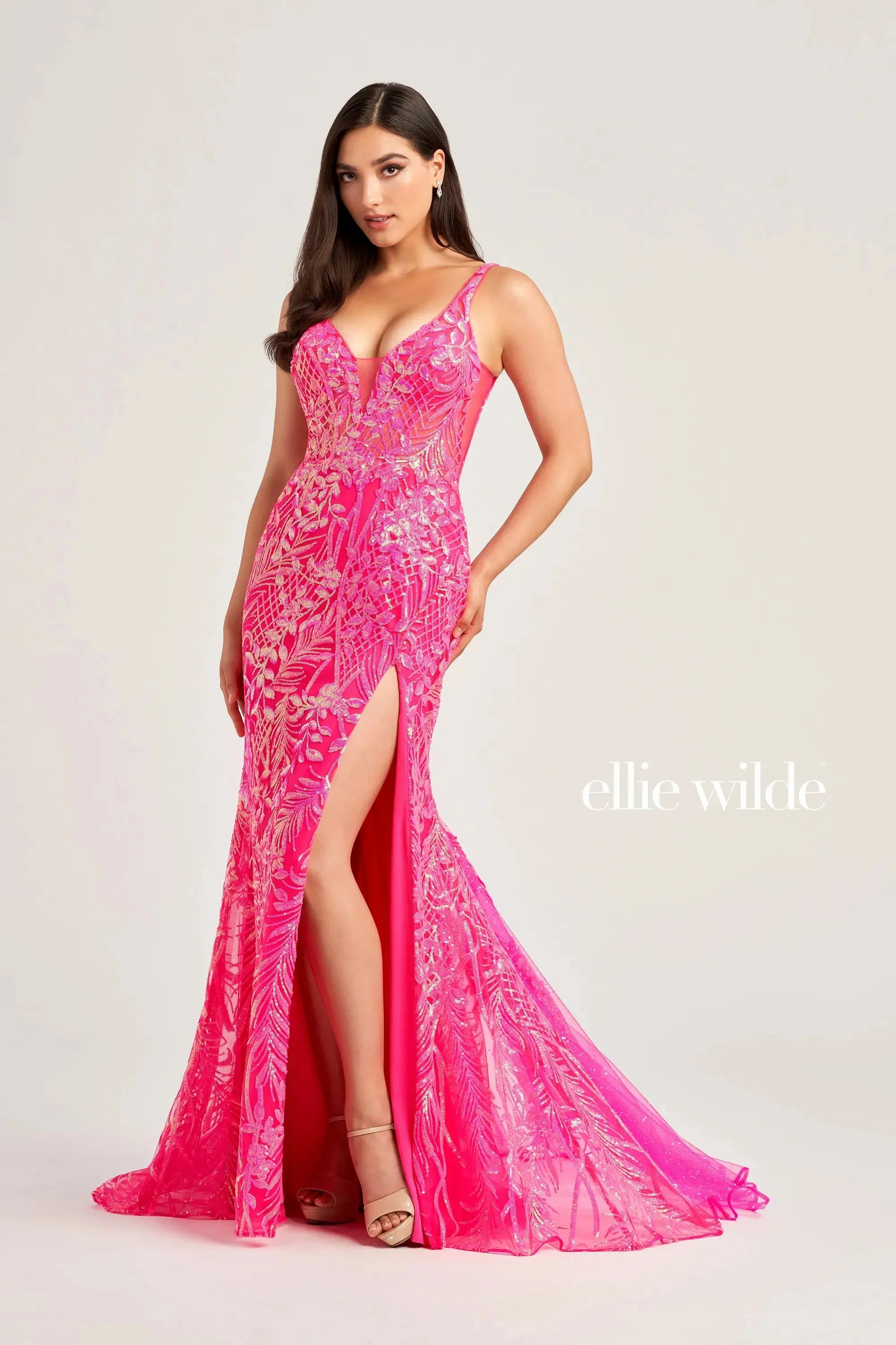 Dazzle through the night with this stunning Ellie Wilde EW35201 evening dress. This dress exhibits an endearing plunging V-neckline on a fitted and sleeveless bodice. It has a mid-open back with a keyhole style, enclosed by a zipper for a refined finish. Additionally, a sheer inset is evident on the top while the skirt reveals an enticing high slit that is evident down to the floor length. It is entirely designed with sequin embellishments, making you look alluring from top to bottom. It also fashions an enchanting mermaid silhouette as well as glamorous glittery sweep train. Charm everyone with your beauty in this mesmerizing Ellie Wilde EW35201 masterpiece. Models are wearing Hot Pink, Light Blue, Purple, and Orange colors.