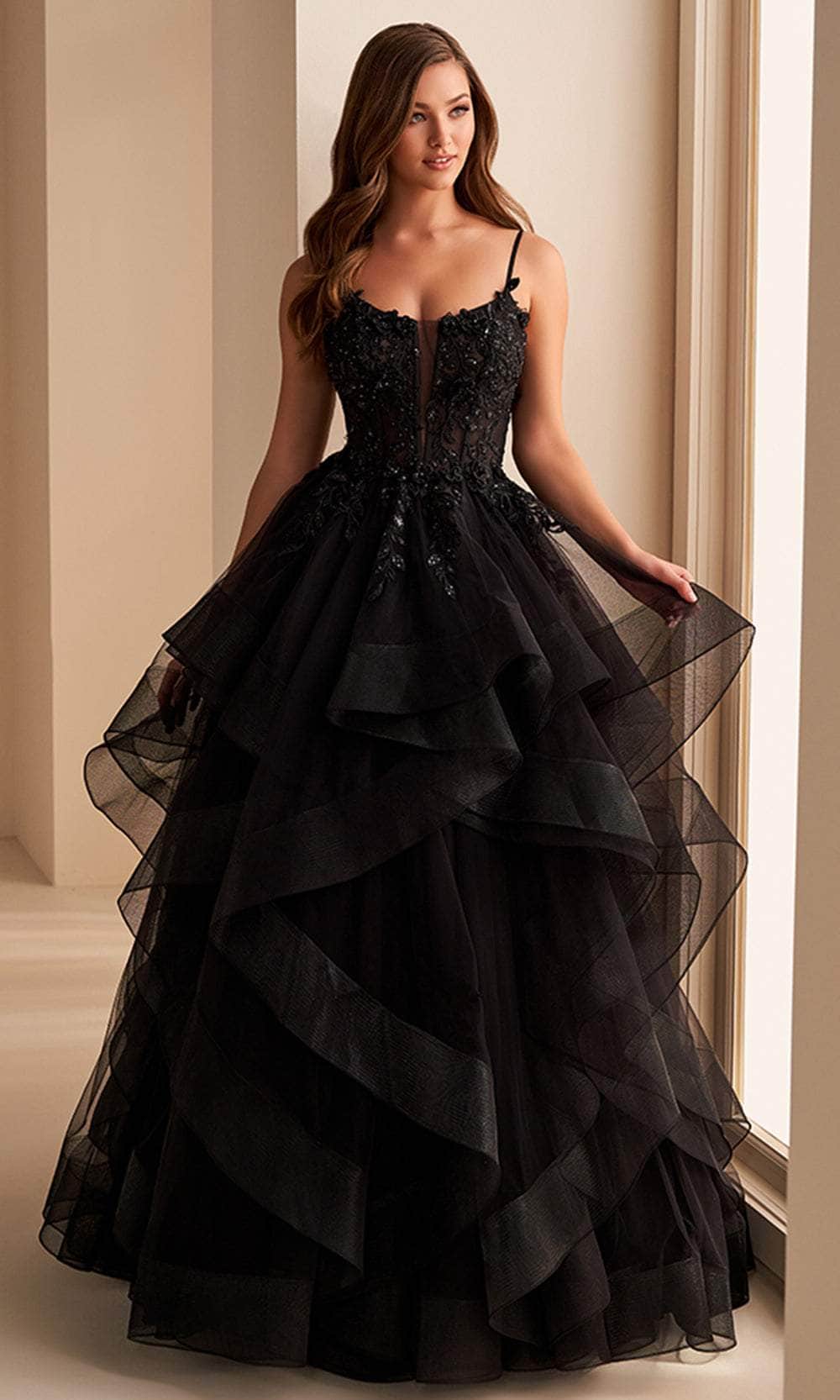 Elevate your style with the enchanting Ellie Wilde EW36225 design. This sleeveless dress is adorned with 3D floral appliques, embroidery, and sparkling sequin for a captivating look. The sheer corset bodice with boning beautifully enhances your curves, while the spaghetti straps and lace-up back provide a flattering and secure fit. The skirt cascades into a full-length ballgown silhouette, completed with a ruffle multilayered design that create a dramatic and regal effect. Embrace your inner princess on your special evening with this Ellie Wilde EW36225 creation. Models are wearing Emerald, Black, Dark Plum, and Blue Haze colors.