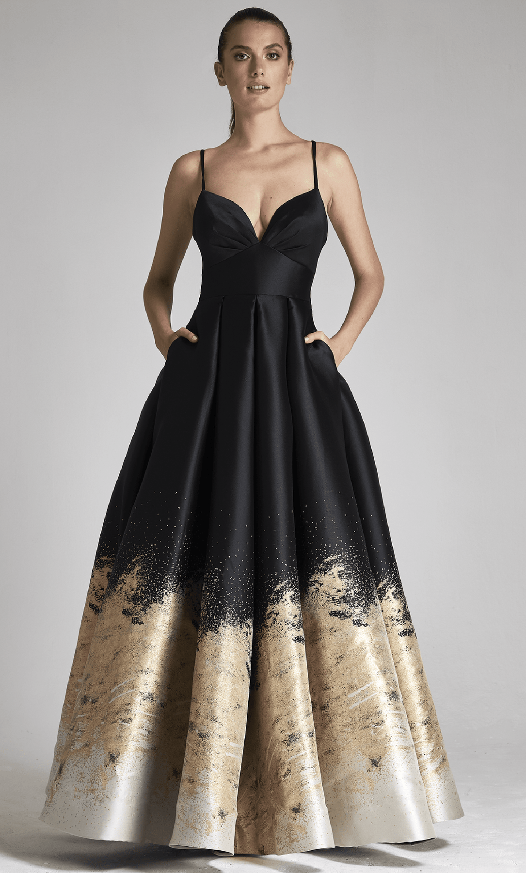 Details: | Sleeveless, Spaghetti Straps, Wide Waistband, Metallic Brocade, Lace-Up Back, Pleated, Pockets, Full Length |