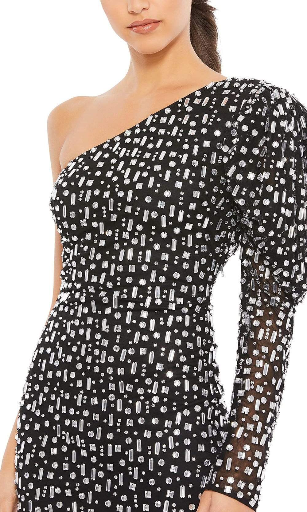 Show off your classy style when you wear this Mac Duggal 10738 dress. The asymmetric neckline and single long sleeve of this cocktail dress make it stand out from the crowd. The appliques on the bodice of the dress extend down the fitting skirt, which also features a bodice that is fitted. Get ready to fall in love with this beautiful Mac Duggal 10738 design. Model is wearing Black color.