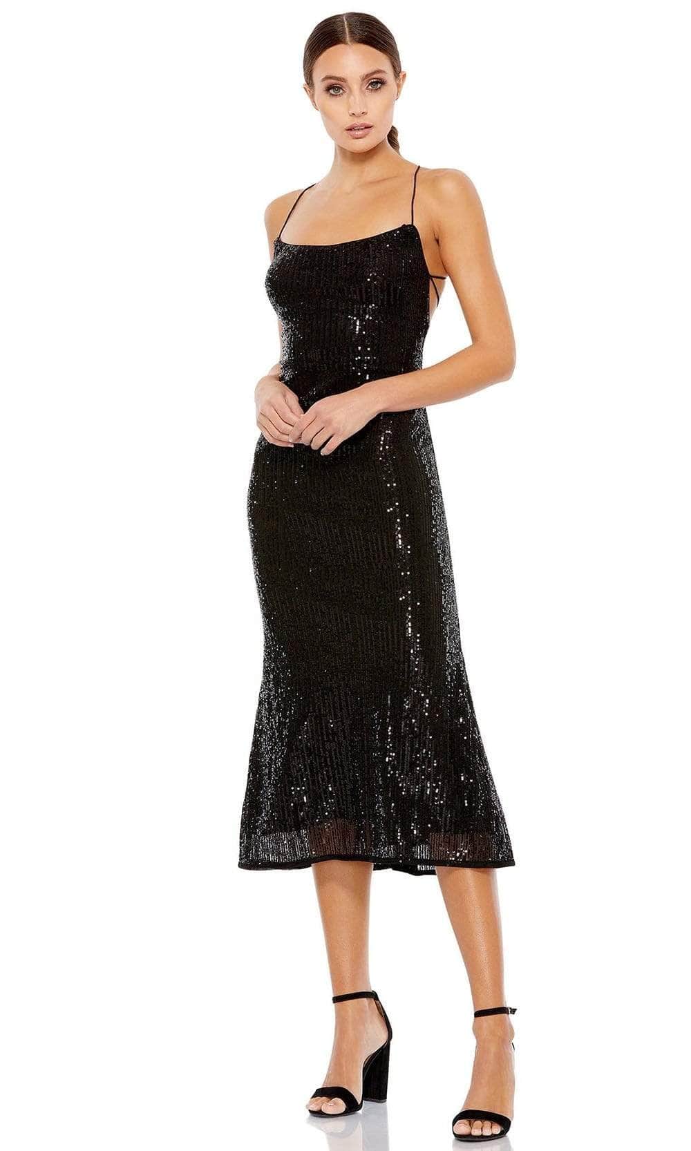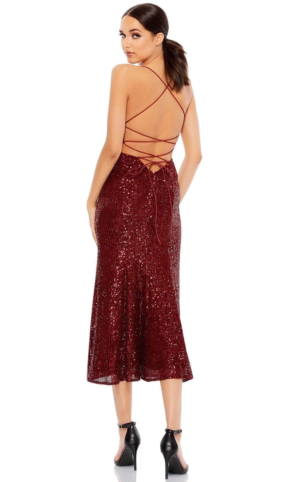 This shimmering Ieena Duggal 26480 dress is stunning in its elegance. A plunging square neckline is supported by spaghetti straps that lace to create an extravagant multi-strapped open back in this figure-flattering sequin-adorned dress. The dress has a midi-length sheath skirt with a modest hem flare. When you wear this Ieena Duggal creation, you will radiate elegance. The model is wearing the Wine color.