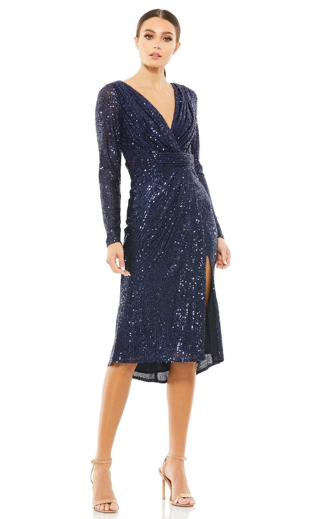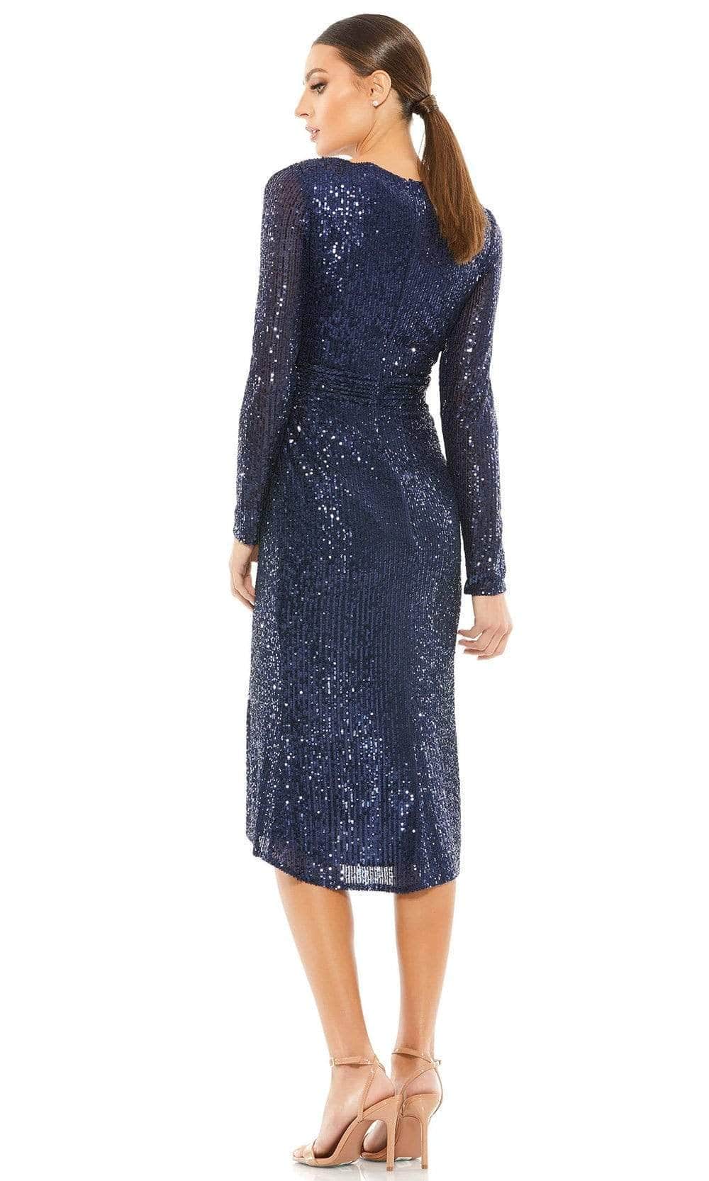 Release your inner sensual queen in this alluring Ieena Duggal 26555 design. This dress features a v-neckline and a full back and is completely covered in shimmering sequins. The sheath skirt has a knee-length hemline, is knee-length, and is draped and collected with a pleated waistband. Shine on the red carpet with this Mac Duggal masterpiece. The model is wearing the Midnight color.
