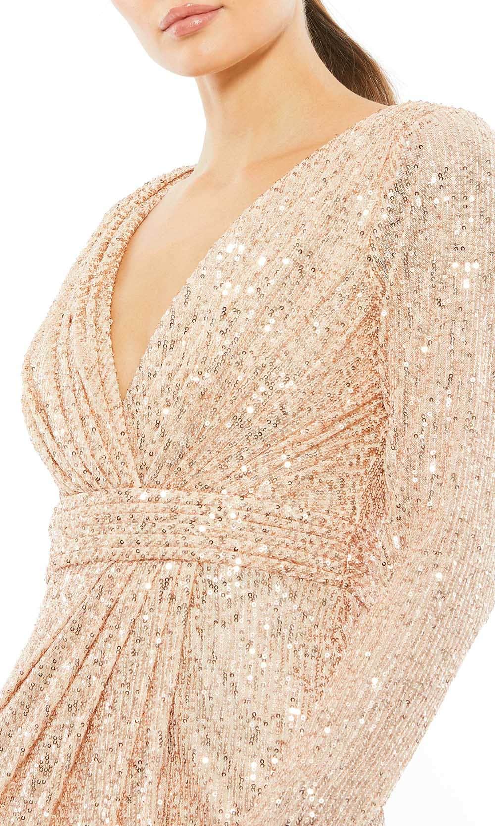 Details: | Sequins, Ruching, Long Sleeves, High Slit, Full Back, Zipper Closure, Knee Length Hem |