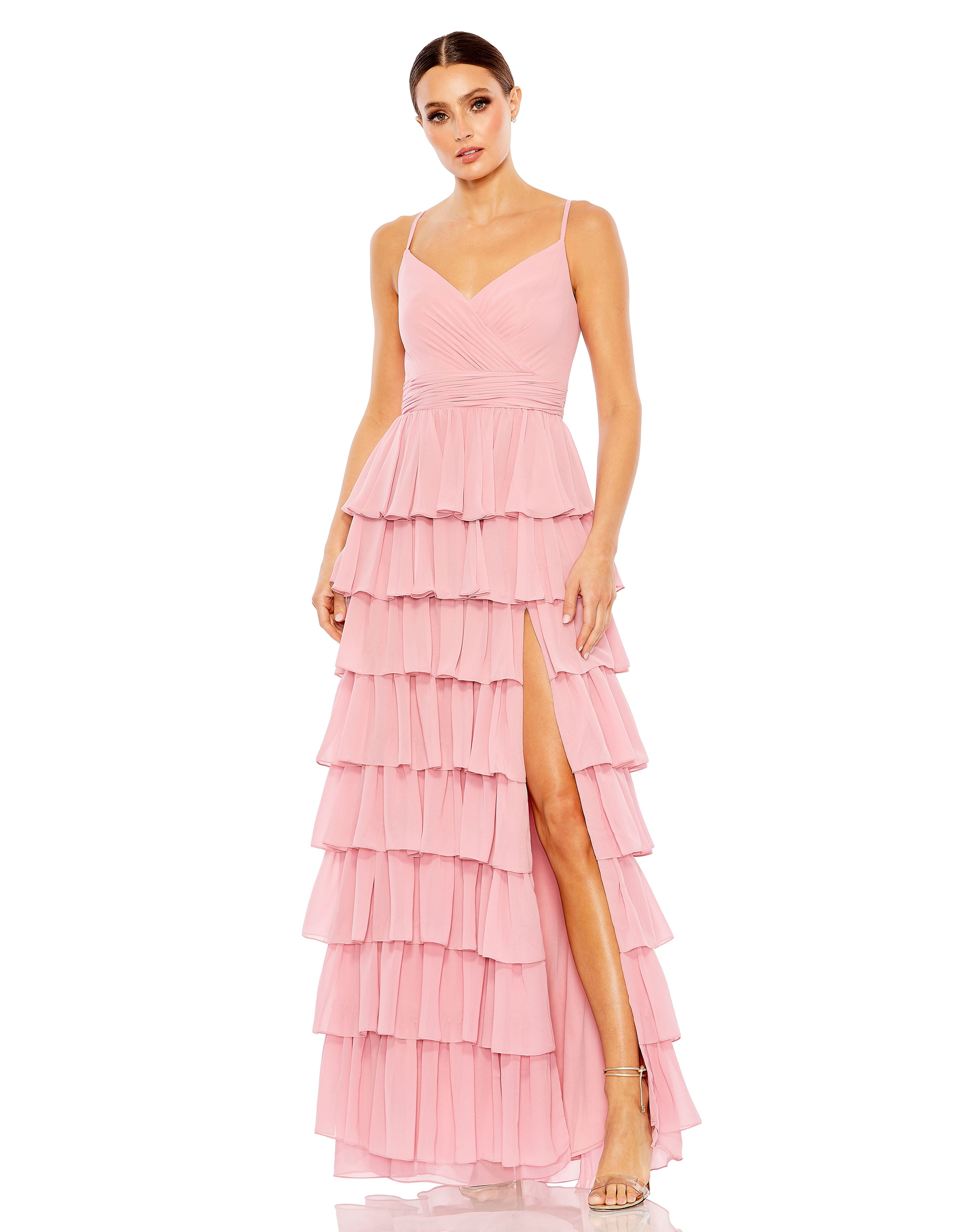 | Details: | Chiffon, Spaghetti Straps, Surplice Bodice, V-Open Back, Zipper Closure, Ruffled Tiers, High Slit, Full Length Hem |