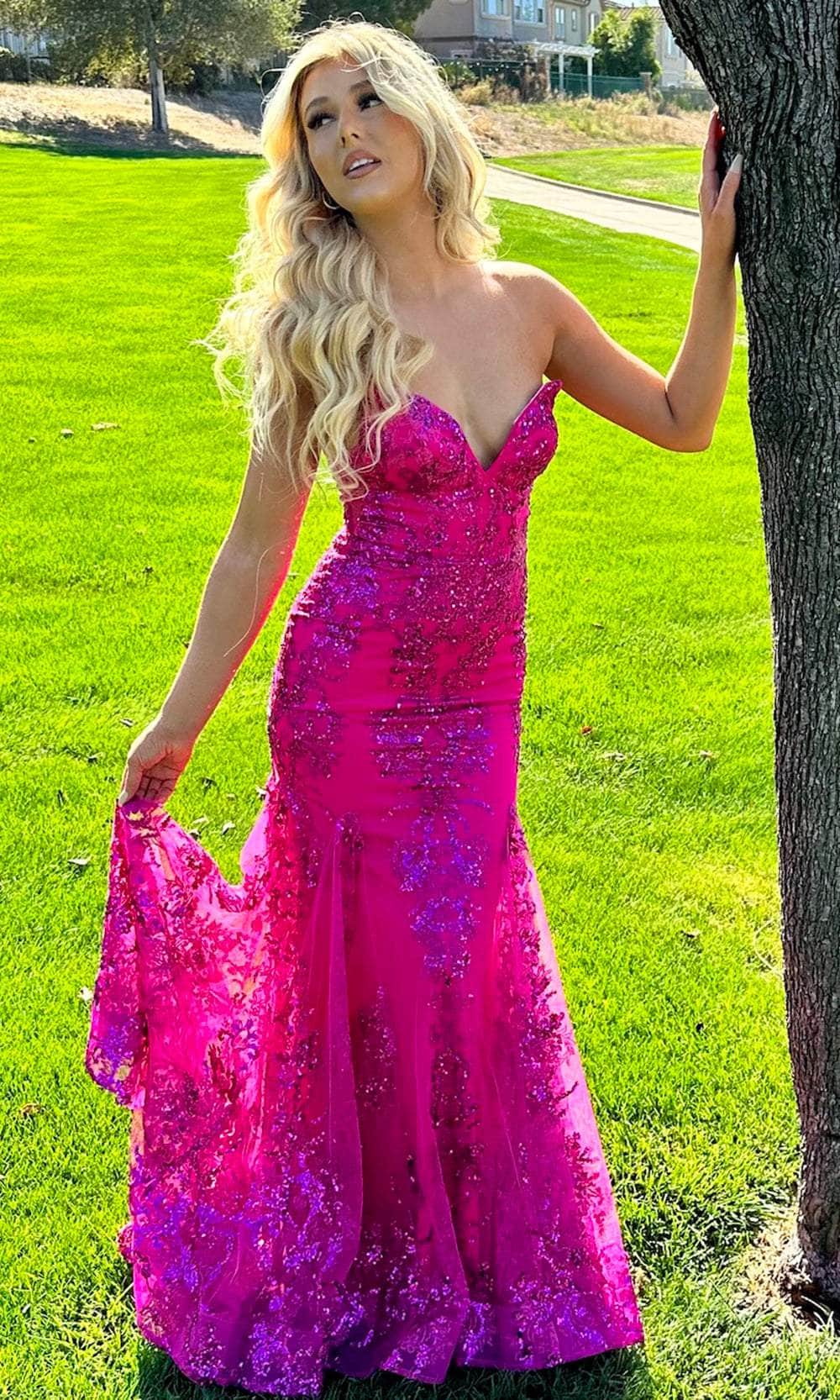 Glide into the ballroom like a stellar vision in this Jasz Couture 7403 creation. Flatteringly styled in a fitted silhouette, this sequin beauty flaunts a sweetheart neckline with side mesh panels for a gorgeous touch. This fabulous gown features a strapless bodice paired with a lace-up back for an adjustable fit. The full-length skirt parades in a mermaid silhouette and finishes with a sweeping train. Glow an immaculate class in this enchanting Jasz Couture 7403. Models are wearing Pink, Black, Fuchsia colors.