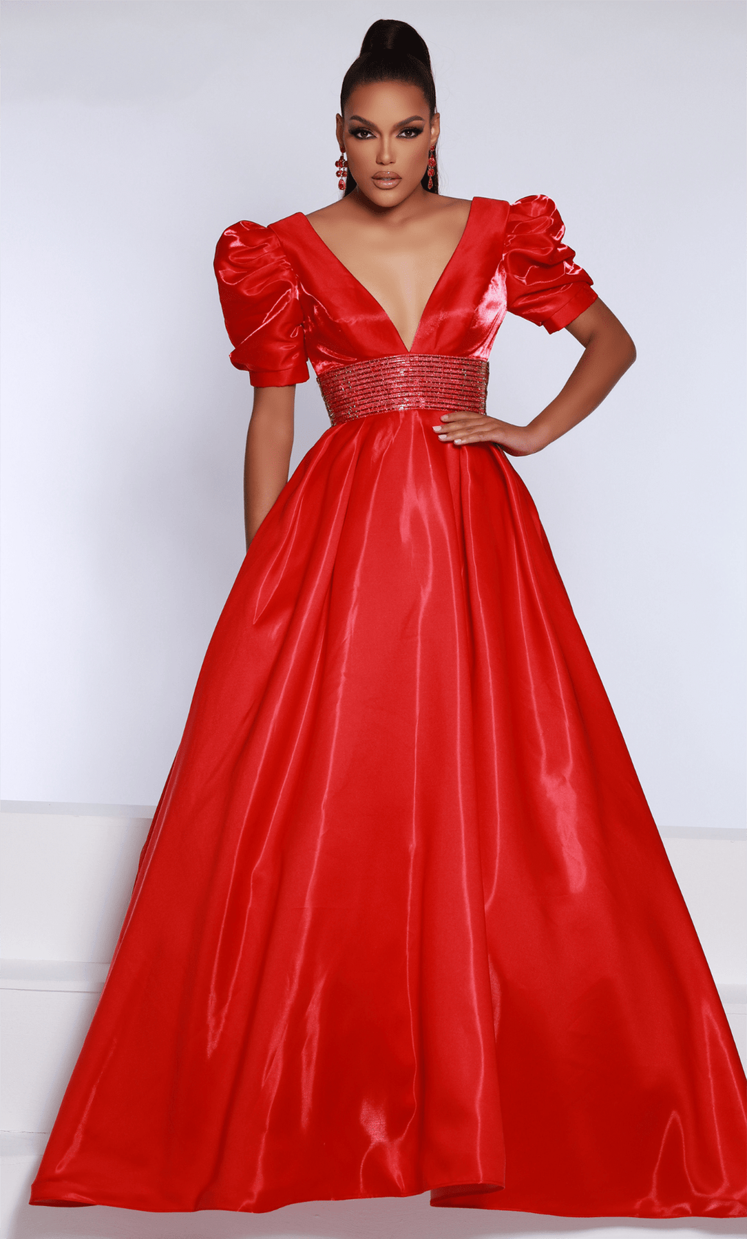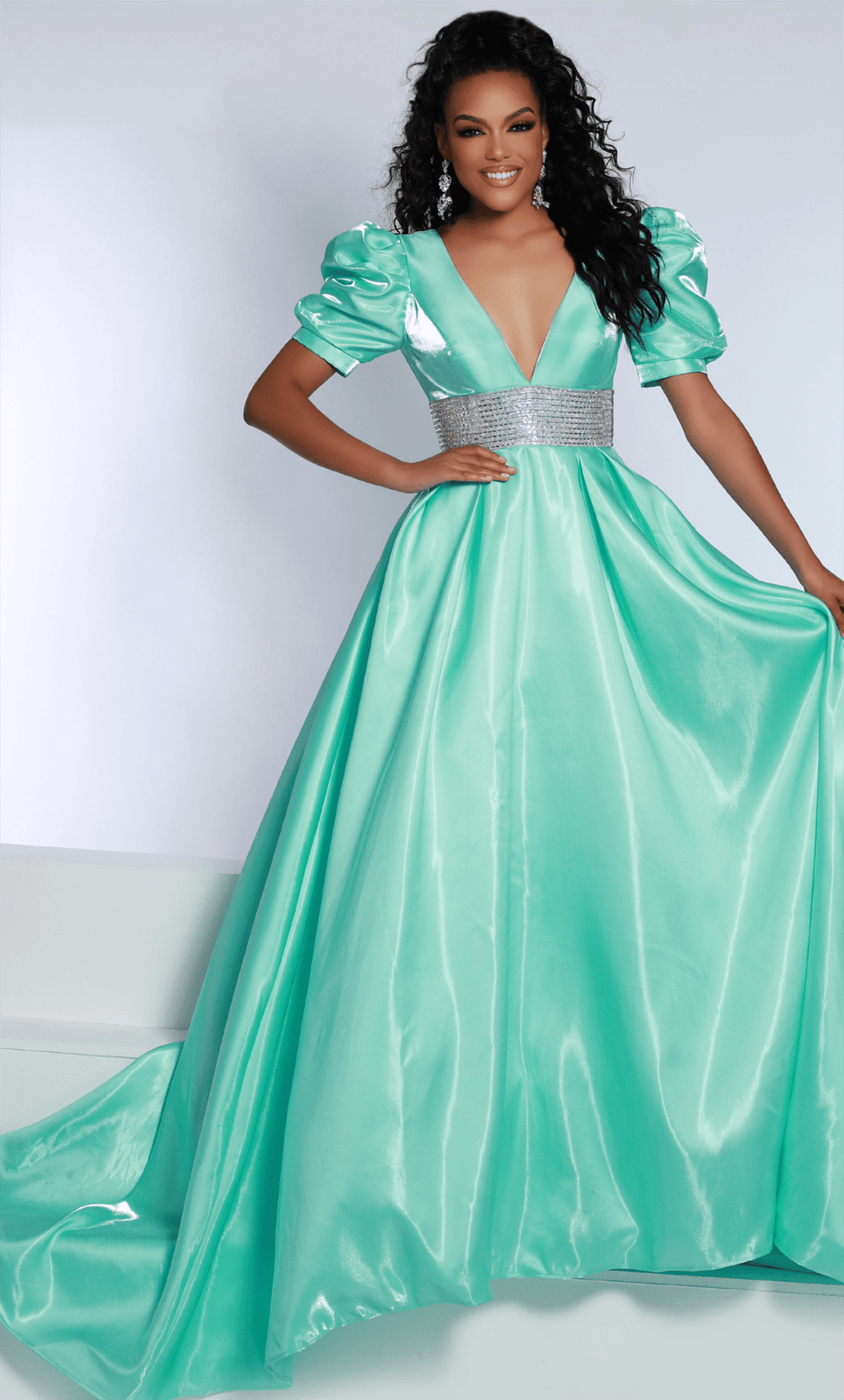 Be the center of attention on your next formal occasion in this opulently designed Johnathan Kayne 2692 creation. Crafted with tailoring lines on a sleek shimmer satin silhouette, this exceptional piece parades a plunging v-neckline. Framed with puff detailed short sleeves and a crystal ornate midriff band, the back is accented with a deep v-design. Cascading with a sleek form, the ballgown skirt touches the floor with a court train. Have all eyes transfixed on you when you don this Johnathan Kayne masterpiece. Models are wearing the Aqua, Black, Red, White, and Emerald colors.