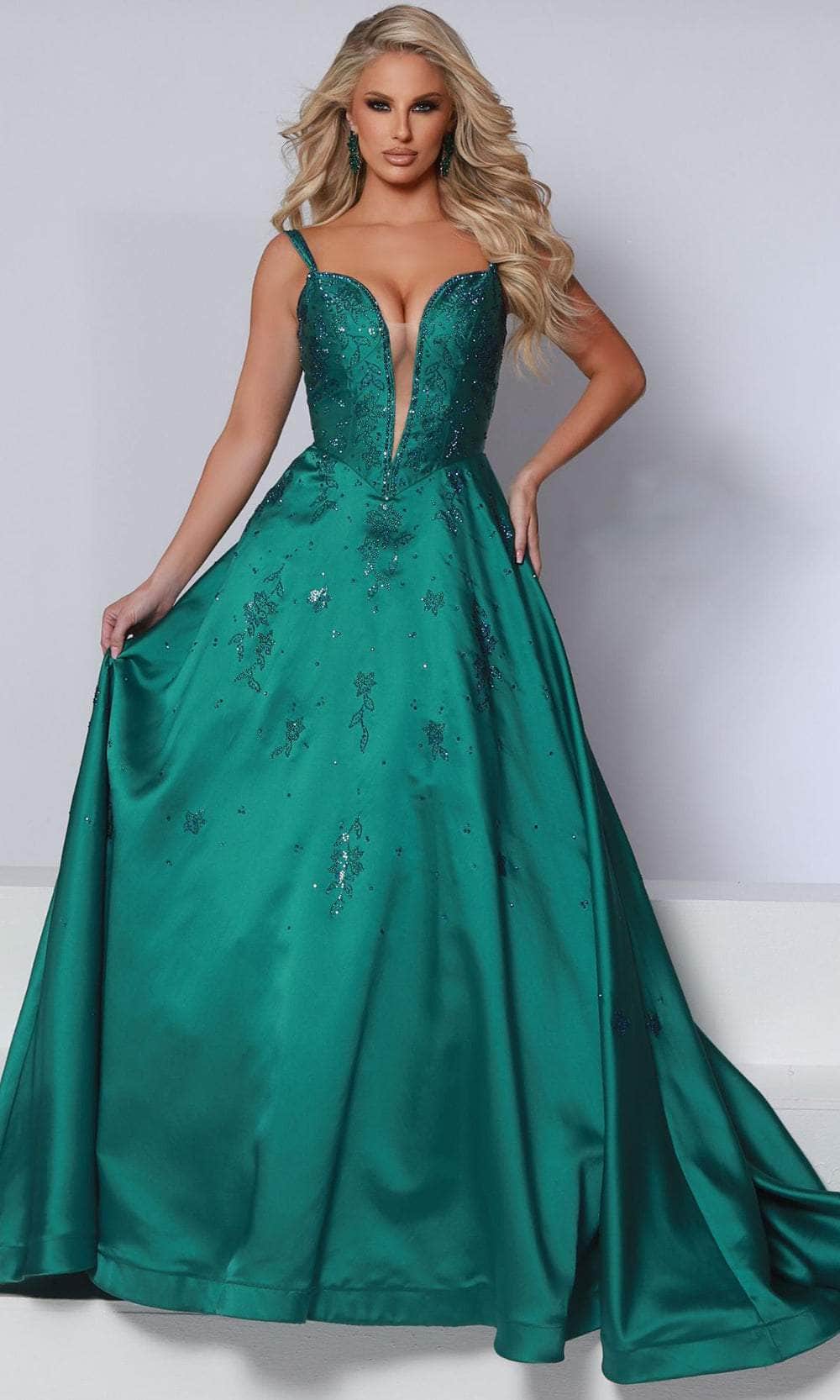 Leave the onlookers starstruck in this Johnathan Kayne 3117 gown. This sleeveless design is made from rich Mikado fabric, and is decorated with beads in floral motifs. The plunging sweetheart neckline is gracefully supported by thin straps, with illusion inset detailing adding an alluring touch to the bust area. A mid-rise scoop design and adjustable lace-up tie closure make the back truly stand out. The skirt descends smoothly, creating a ballgown silhouette that culminates in a sweeping train and a horsehair hem. With this Johnathan Kayne 3117 masterpiece, you are bound to feel like the star of the evening. Models are wearing Black, Cinderella Blue, Fuchsia, and Emerald colors.
