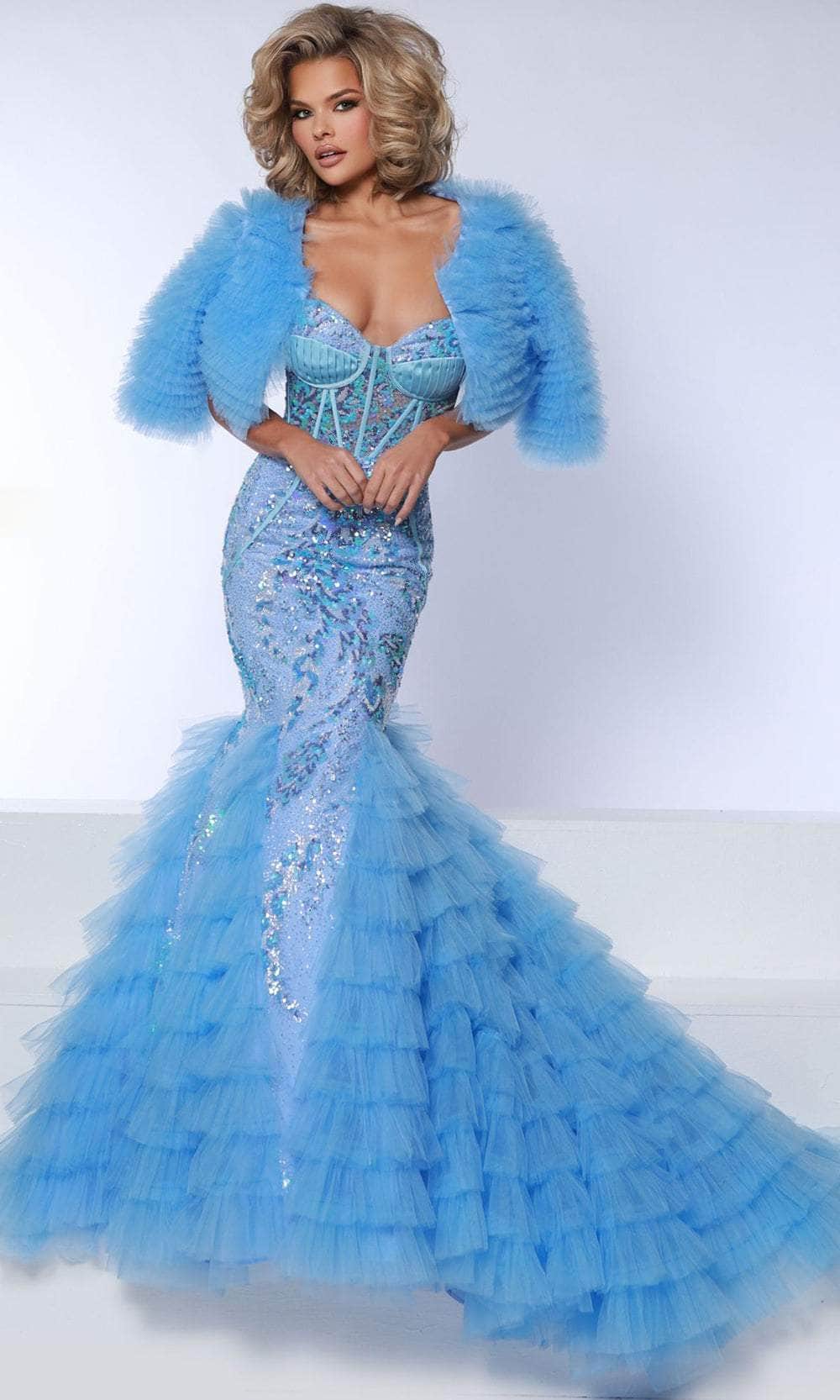 Catch all the glances with the Johnathan Kayne DKS7 gown, a masterpiece of elegance and charm. This exquisite dress is crafted from embroidered sequin mesh with a stretch lining, offering both comfort and style. The strapless fitted bodice, complete with structured boning and a sweetheart neckline, enhances your figure beautifully. The floor-length skirt features a stunning mermaid silhouette with ruffle tulle details and a dramatic train, creating a captivating look. Perfect for any special occasion, this Johnathan Kayne DKS7 ensures you shine brightly, leaving a lasting impression with every graceful step. Models are wearing Midnight and Powder Blue colors.