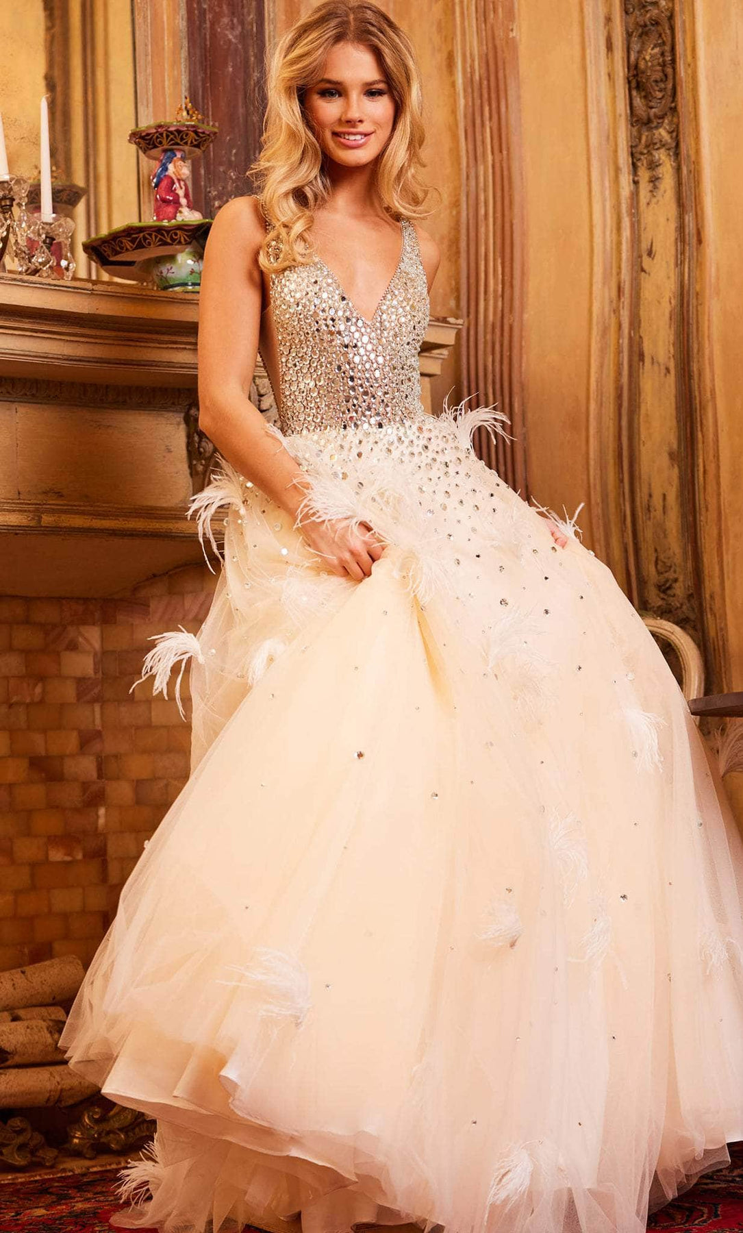 Set a style that would engage everyone in this enchanting evening in this Jovani 24255 masterpiece. The fitted bodice is completely garnished with crystal beadwork that is beautifully sprinkled along the full skirt. It features a deep v-neckline held by wide shoulder straps and an alluring sheer inset on the side midriff. The layered tulle skirt flares a ballgown silhouette in a full length hem and sweeping train, completed with a feathers design for added drama. Get ready to shine in this fabulous Jovani 24255 creation. Model is wearing the Nude/Silver color.