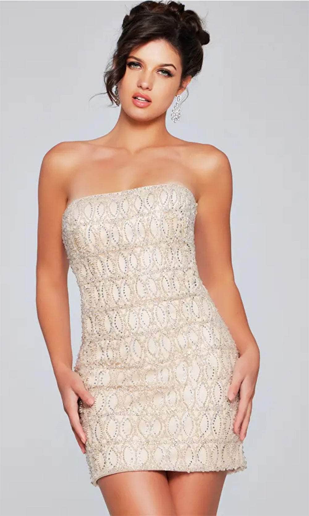 Exhibit your trendsetting style when you don this Jovani 42197 dress. The geometric beaded embellishments throughout the strapless dress give it a dazzling and striking appearance. In addition, it has a sweetheart neckline and a mid-open back with a center zipper closing for a comfortable and attractive fit. The sheath skirt perfectly accentuates your contours and culminates in a seductive short hemline. The Jovani 42197 masterpiece is ideal for a standout style and impeccable fit. Models are wearing Nude, and Purple/Nude colors.