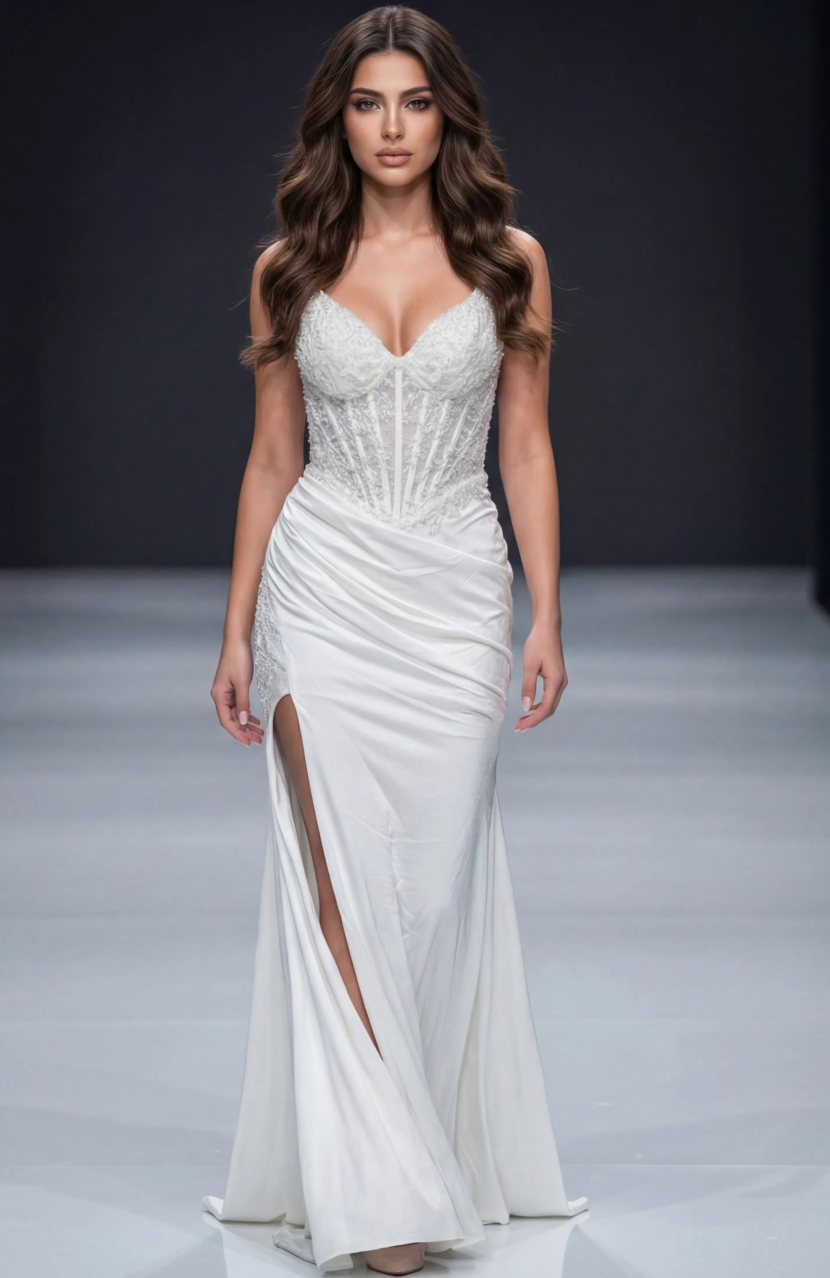 Details: Spaghetti Straps, Sequin, Lace Applique, Ruched, See-Through Corset Bodice, High Slit, Mid-Open Back, Sweep Train