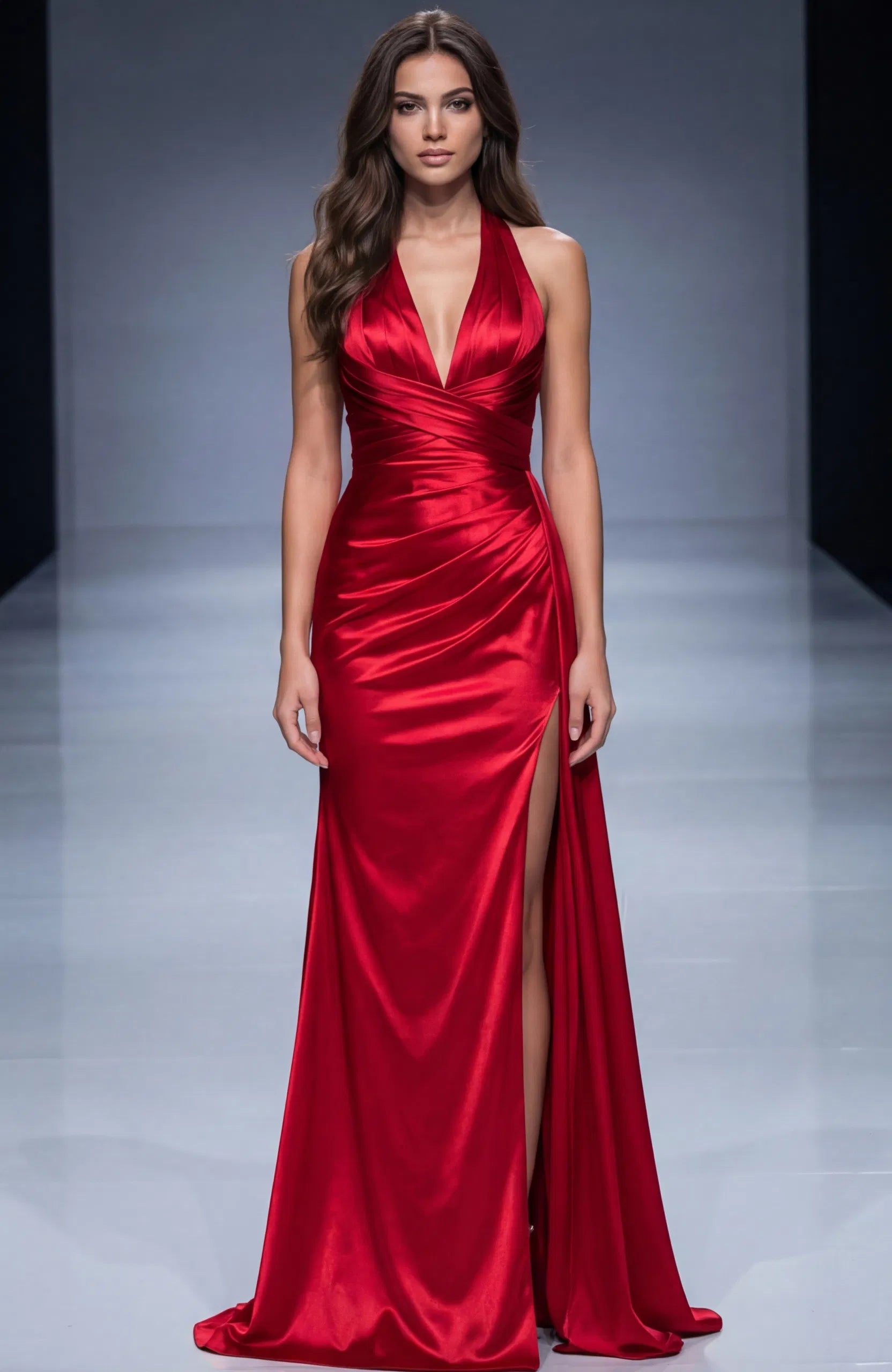 | Details: | Fitted, Sleeveless, Crisscross, Pleated, Plunging Neck, Draped, High Slit, Floor Length, Open Back, Back Bow |