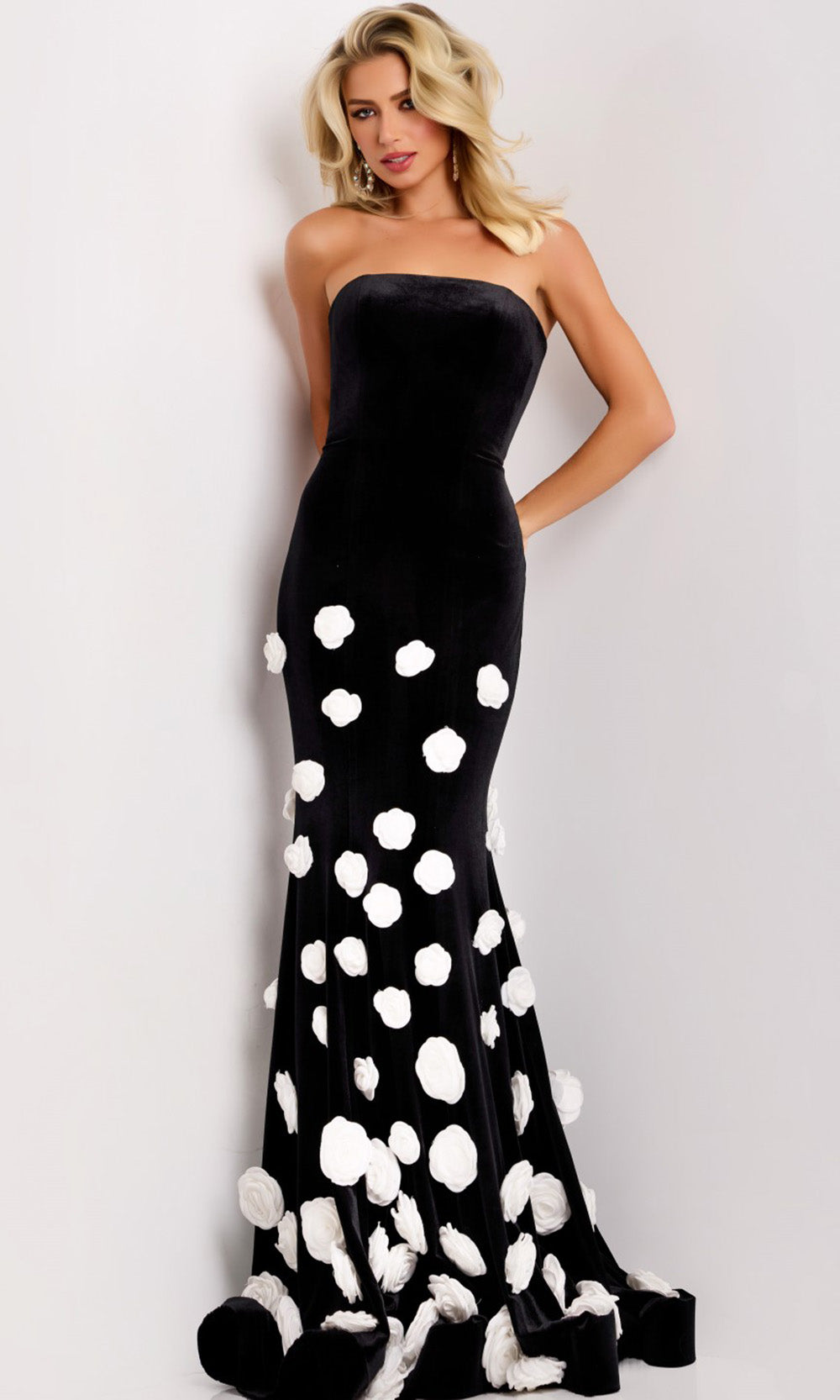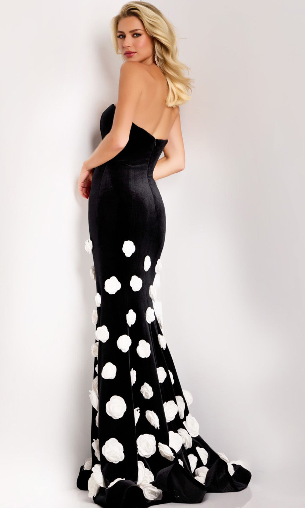 Striking in its minimalism yet rich in detail, the Jovani 45238 offers a fresh take on the classic mermaid gown. The smooth velvet fabric provides a luxurious backdrop for whimsical 3D floral appliques that bloom along the skirt. A strapless straight across neckline balances the gown sculpted fit, leading into a natural waistline that elongates the frame. The mermaid skirt flares subtly into a floor length hem, ending in a graceful sweep train. Jovani 45238 captures the essence of modern elegance with its blend of sleek fabric and textured floral accents. Model is wearing Black/White color.