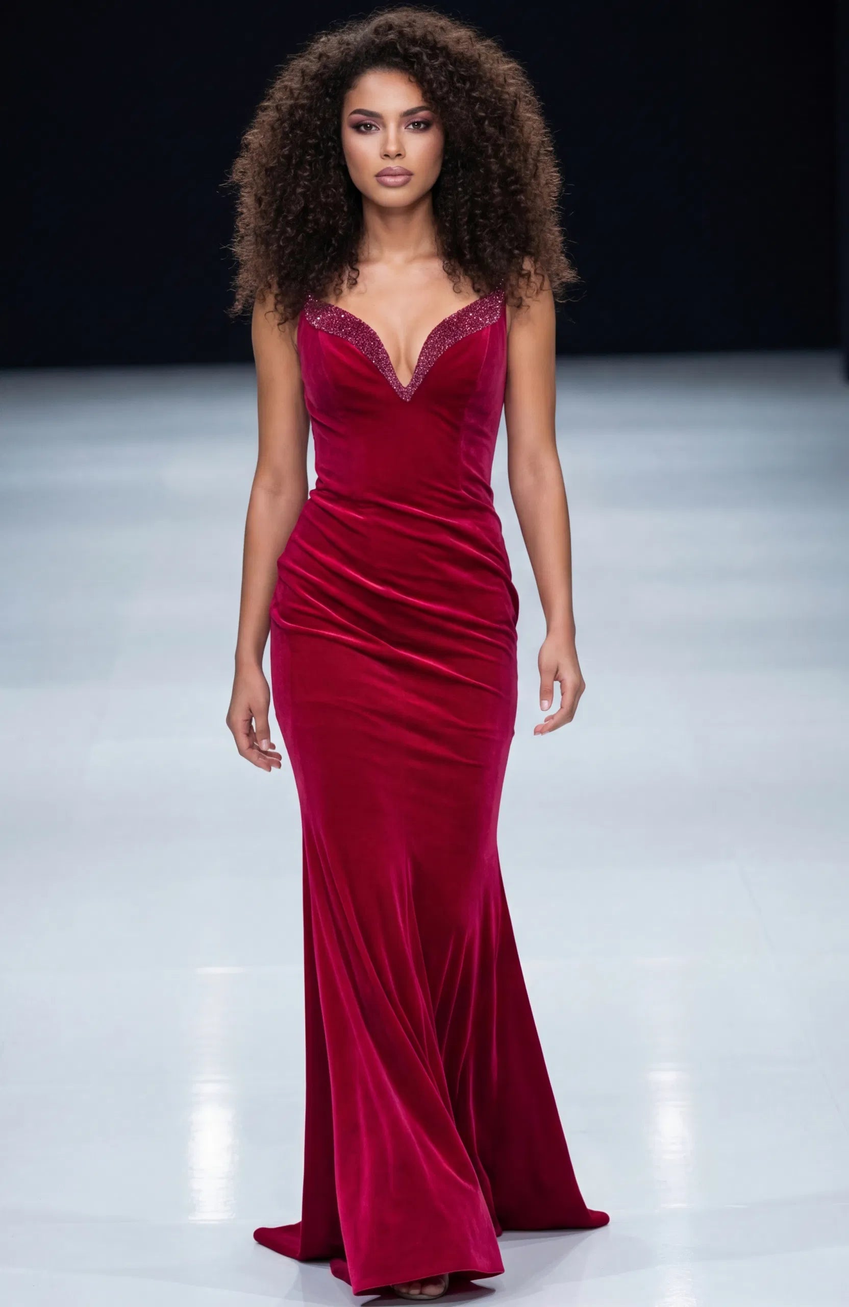 Step into Jovani 45479 and embody pure evening sophistication. The dress captures effortless allure through its rich velvet fabric and curve-skimming fit. The strapless sweetheart neckline is adorned with crystal beaded trim for subtle sparkle, while the smooth velvet texture brings depth and luxury. A sleek sheath silhouette and sweep train create a timeless shape that enhances your natural form. Perfect for galas or formal events, Jovani 45479 combines classic refinement with understated glamour. Model is wearing Brown color.